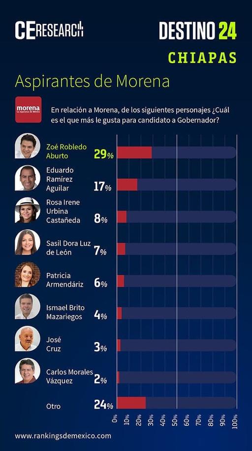 Además, la encuesta señala que el actual director general del IMSS, Zoé Robledo, es el más aventajado aspirante a la candidatura de MORENA para las elecciones a gobernador del estado en 2024, aventajando a su más cercano competidor con un margen del 12%.