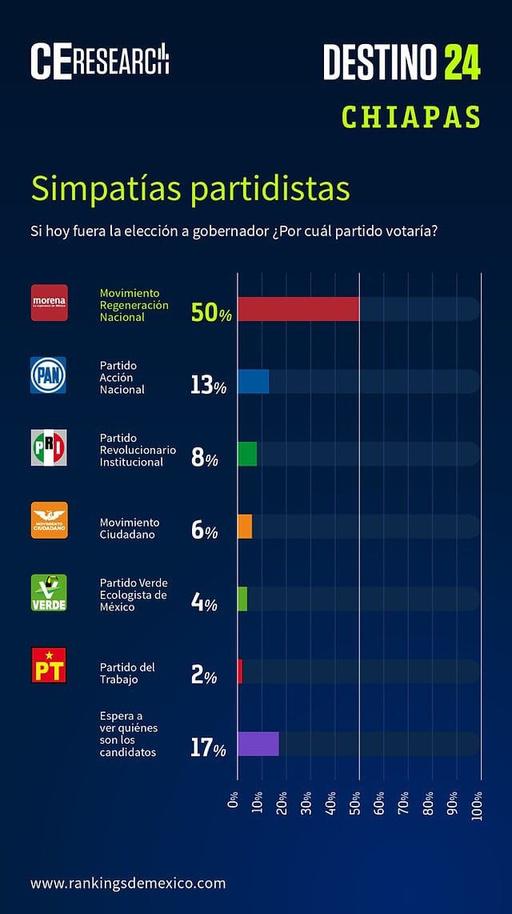 Según la encuesta telefónica más reciente realizada por la firma C&E Research, la principal fuerza política en Chiapas es MORENA con un 50% de intención de voto.