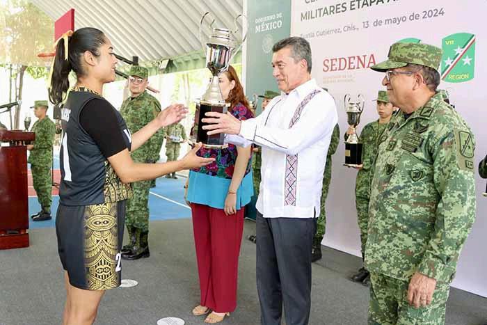 El gobernador Rutilio Escandón participó en la ceremonia de premiación de los Juegos Militares Etapa Área Geográfica Sur 2024, destacando el papel de la Secretaría de la Defensa Nacional en fomentar el deporte y la integración institucional. Reconoció el esfuerzo y disciplina de los soldados mexicanos en la práctica deportiva.