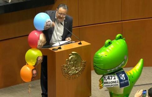 Y es que el senador Gabriel García, quien manejara un fideicomiso del cual se nutrió el movimiento obradorista, llevó cuatro globos con los rostros de los ex presidentes Salinas, Fox y Calderón, y el del empresario Claudio X. González; junto con un dinosaurio inflable, con un cartel que contenía la cifra de mil 478 millones.