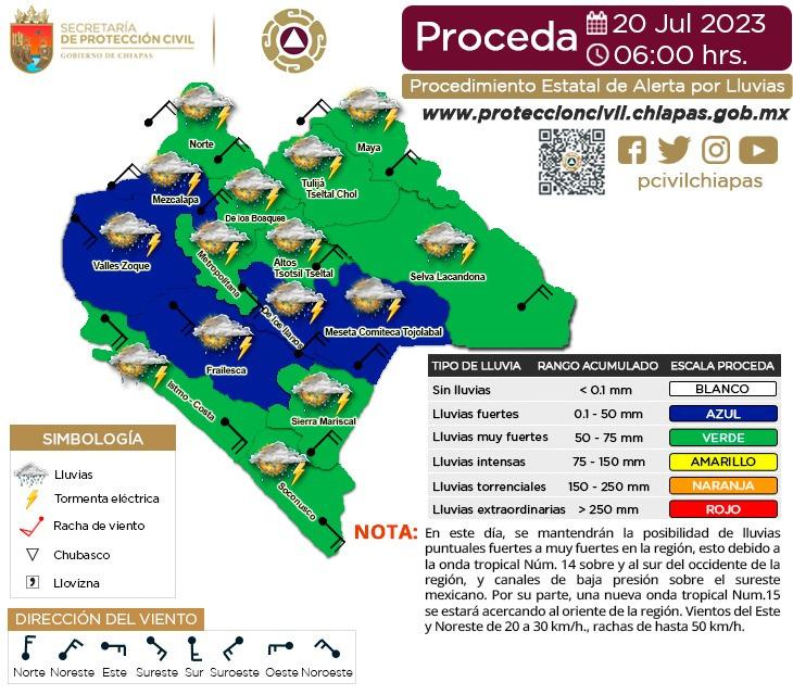 #Proceda | Se esperan #Lluvias muy fuertes en las regiones Norte, De los Bosques, Metropolitana, Altos, Tulijá, Maya, #SelvaLacandona,Istmo-Costa, Sierra y Soconusco.