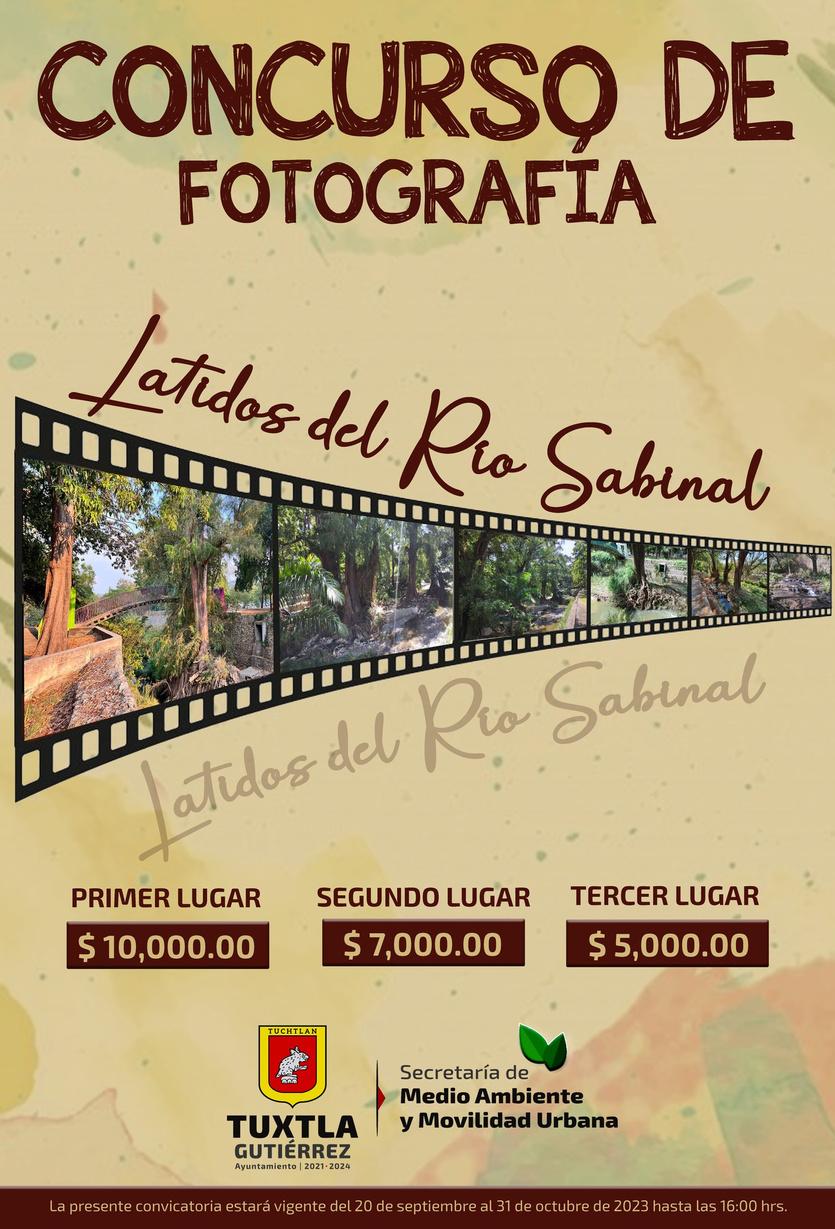 El Ayuntamiento de Tuxtla Gutiérrez, a través de la Secretaría de Medio Ambiente y Movilidad Urbana, invita a la ciudadanía a participar en el Concurso de Fotografía "Latidos del Río Sabinal". Las bases del concurso están disponibles en las imágenes publicadas.