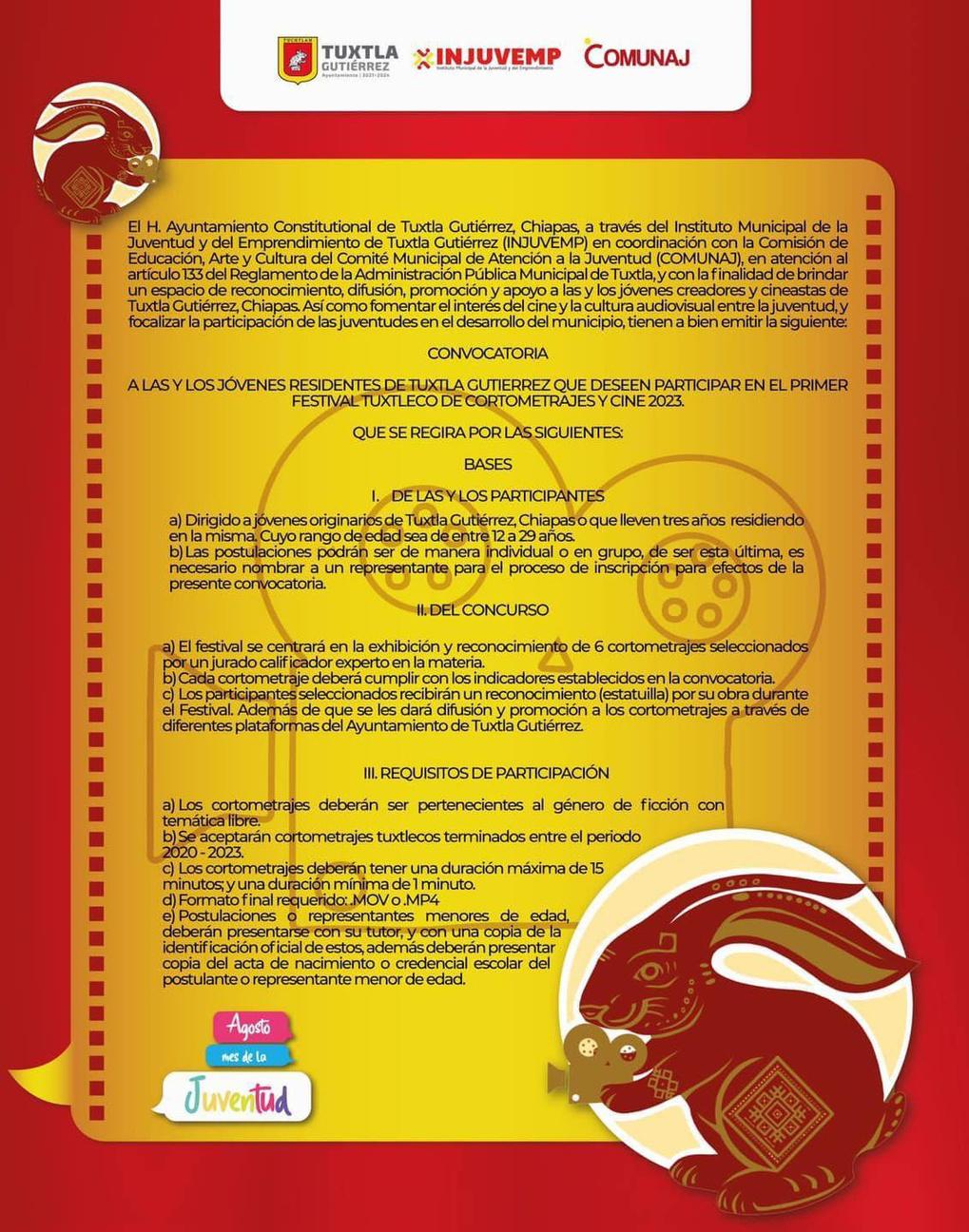 Aún estás a tiempo de inscribirte al primer Festival Tuxtleco de cine y cortometraje. Este es un emocionante espacio para reconocer y celebrar tu talento artístico detrás de la cámara. Para participar, simplemente regístrate en el enlace proporcionado en la publicación. También puedes conocer las bases del festival a través del enlace adjunto.