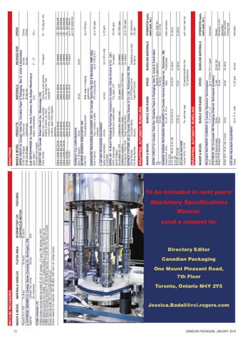 Wide range of wrapping applications SANDIACRE PACKAGING MACHINERY INC. (In Canada: Techno Pak (QC & Maritimes), PMR (ON)) Rose Forgrove Trays, crackers, cookies, OPP, polypropylene Up to 14’W & 24”L hardware SATURN PACKAGING EQUIPMENT • Sigma semi-automatic various various Up to 48 in wide & automatic SAPAL SA - A Bosch Packaging Technology Company (In Canada: Charles Downer & Co., Ltd.) SAPAL single stage Chocolate bars coated wafers Foil, paper, OPP On request diefold wrappers Foil wrappers BI, DPN Confectionery items small Foil, paper, OPP On request Doubletwist wrappers Confectionery items Cellophane, OPP Pack size On request ChocoSprint, Pillow Twist Small Chocolate Bars On request SIGPACK SYSTEMS AG (In Canada: Charles Downer & Co. Ltd., Richmond Hill, ON) Diefold Machine Chocolate tablets AL/OPP/Paper/Carton Depending on project Roll Wrap Machine Biscuits Paper/OPP/Carton As above