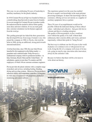 The experience gained over the years has enabled Piovan to acquire vast knowledge in the main polymer processing techniques. It shares this knowledge with its customers, offering services not merely as a supplier of auxiliary equipment, but as a partner. These 50 years of accomplishments would not be possible without the dedicated sharing of those ethical values - individual and collective - that gave life first to a dream and then to a leading enterprise. The quality of Piovan products, in fact, would not exist without the quality of its staff, without their enthusiasm, their concrete ability and vision, and most importantly, without their pride in “being Piovan”. The best way to celebrate our first 50 years in the world of plastic is to continue to do so with passion for our work, living the life of a company well aware of its key role, going on step by step, innovation after innovation, always by the customer’s side. Because we believe that there will be a lot more to write about our history.