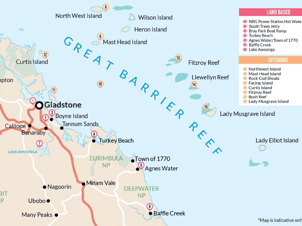 Known in the fishing fraternity as a seafood smorgasbord, the Gladstone Region provides a plethora of places to fish all year round for all skill levels; from beaches to islands, reefs, estuaries and creeks. You’ll be blown away by the range of fish species which include Sweetlip, Coral Trout, Tuna, Mackerel, Barramundi, Bream, Grunter, Trevally, Jewfish, Queenfish, Saratoga, Finger Mark Perch, King or Threadfin Salmon, and Mudcrabs.