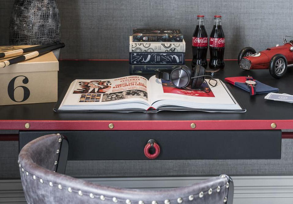 The solid wooden desk tells a story of beautiful quality, whilst the wild floral display reinforces the cottage-style charm found throughout the design of this property. Metallic and trendy, these carefully selected accessories come together to create a stylish study area, this contemporary leather desk chair and table lamp adding a hint of industrial flair.