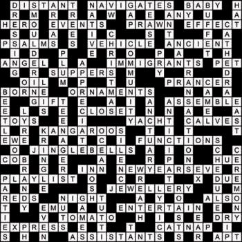 ACROSS: 1 Dessert, 5 Apple pies, 10 Baby, 13 Air, 14 Hero, 15 Events, 16 Prawn, ce,17 Offi 20 Psalms, 21 In haste, 23 Ambient, 27 Angel, 29 Illuminate, 31 Jew, 32 Suppers, 33 Nil, 35 Prancer, 37 Drone, 38 Ornaments, 40 Gift, 42 Assemble, 45 Closet, 46 Cake, 47 Yacht, 48 Coldie, 49 Kangaroos, 52 Rye, 54 Functions, 56 Jingle Bells, 58 Cub, 60 Hue, 61 Inn, 63 New Year’s Eve, 66 Playlist, 67 Doe, 68 Jewellery, 71 Reds, 72 Night, 75 Also, 76 Emu, 77 Entertain, 79 Tomato, 80 Dry, 82 Leapers, 85 Catnap, 86 Assistants, 87 Two. DOWN: 1 Dressing, 2 Smouldering, 3 Ewers, 4 Trees, 5 Attain, 6 Pi, 7 ESP, 8 Image, 9 Santa, 10 Bro, 11 Buffet, 12 Bee, 18 Cathedral, 19 Christmas, 22 Solemnity, 24 Moa, 25 Plum, 26 Fir, 28 Appreciate, 30 Transactions, 33 No, 34 Leis, 36 Camel, 37 Dancer, 39 Sanctuary, 41 Teenagers,