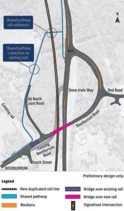 The project will see the Barrs Rd level crossing closed and replaced with an overpass for traffic and a new bridge entrance to Beerburrum will be built and new traffic lights on Steve Irwin Way will also be installed as part of the realigned