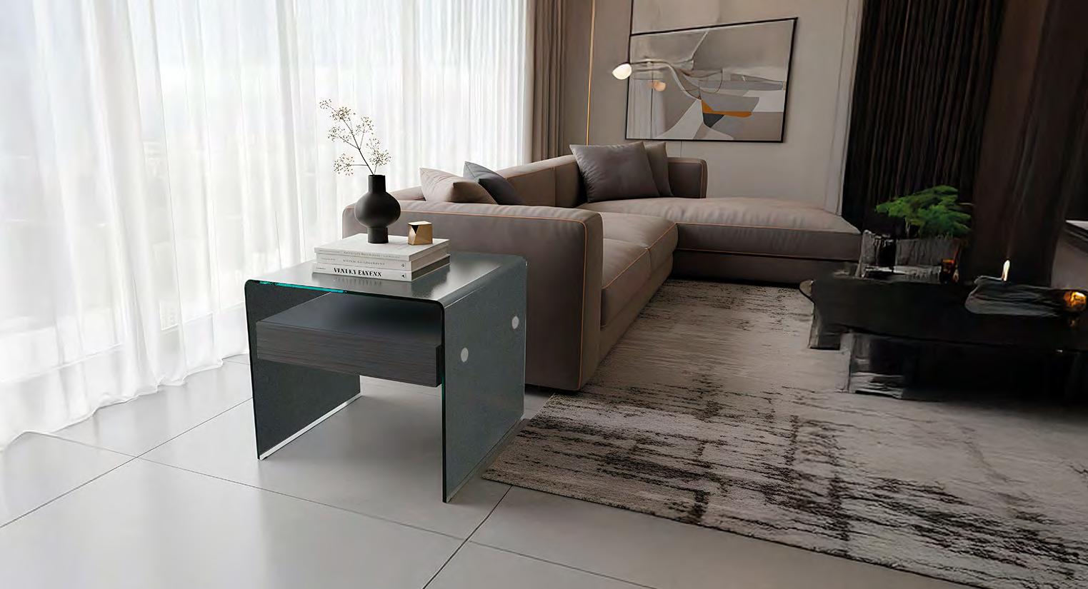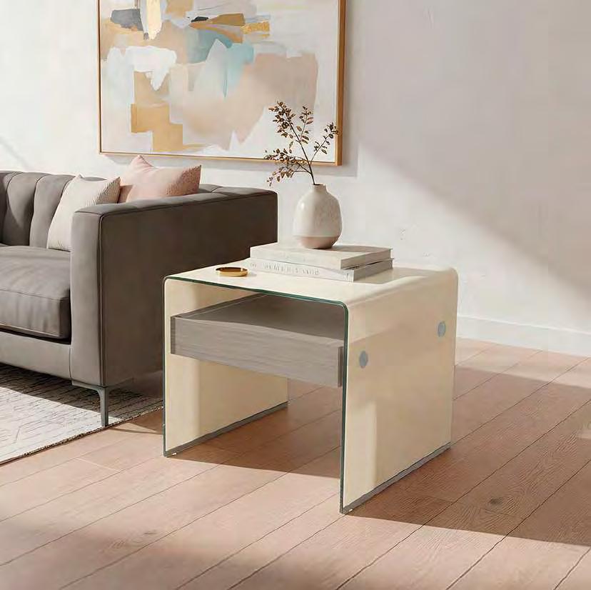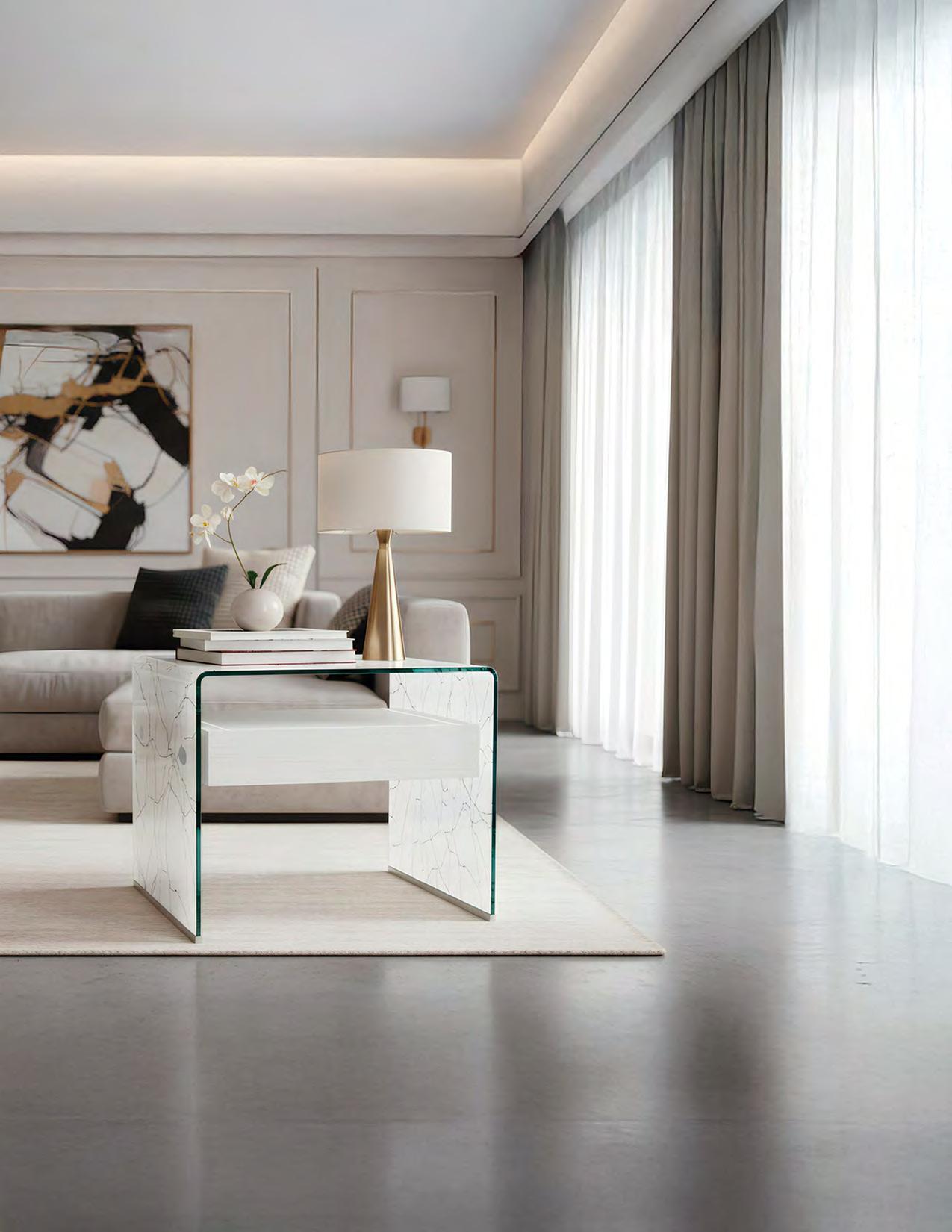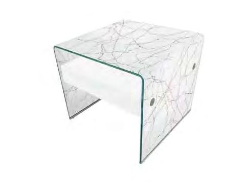 6mm extraclear tempered glass. Drawers with concealed runners & soft close system. Lacquered Wood Finish.