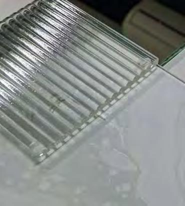 10mm extraclear bent glass. Anodized Aluminum support rails for bottom glass edge with plastic bumpers.