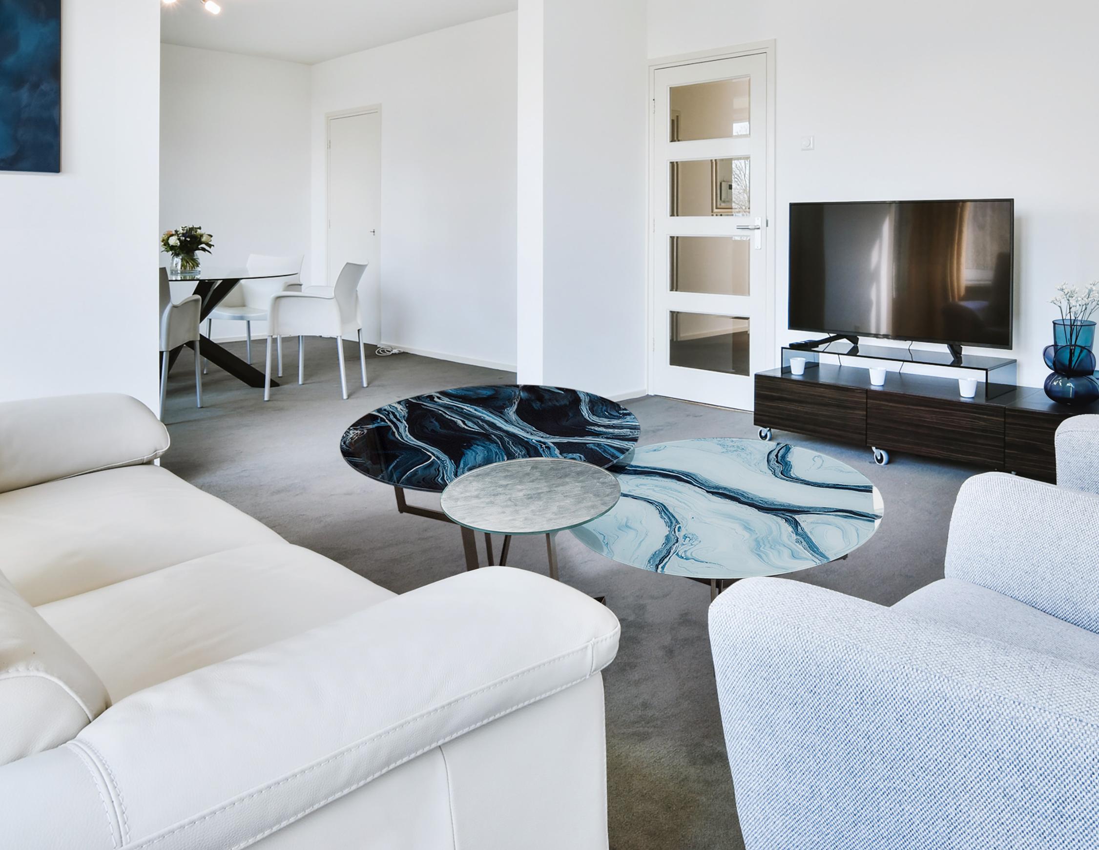 4mm extraclear tempered glass. Wood finish in lacquered natural oak or walnut veneer. Metal Legs with adjustable levelers.