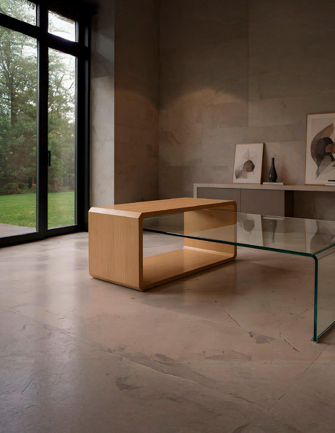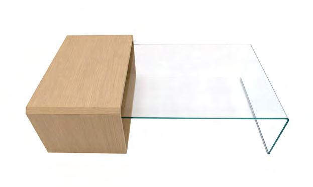 4mm extraclear tempered glass. Wood finish in lacquered natural oak or walnut veneer. Metal Legs with adjustable levelers. Size: W D H