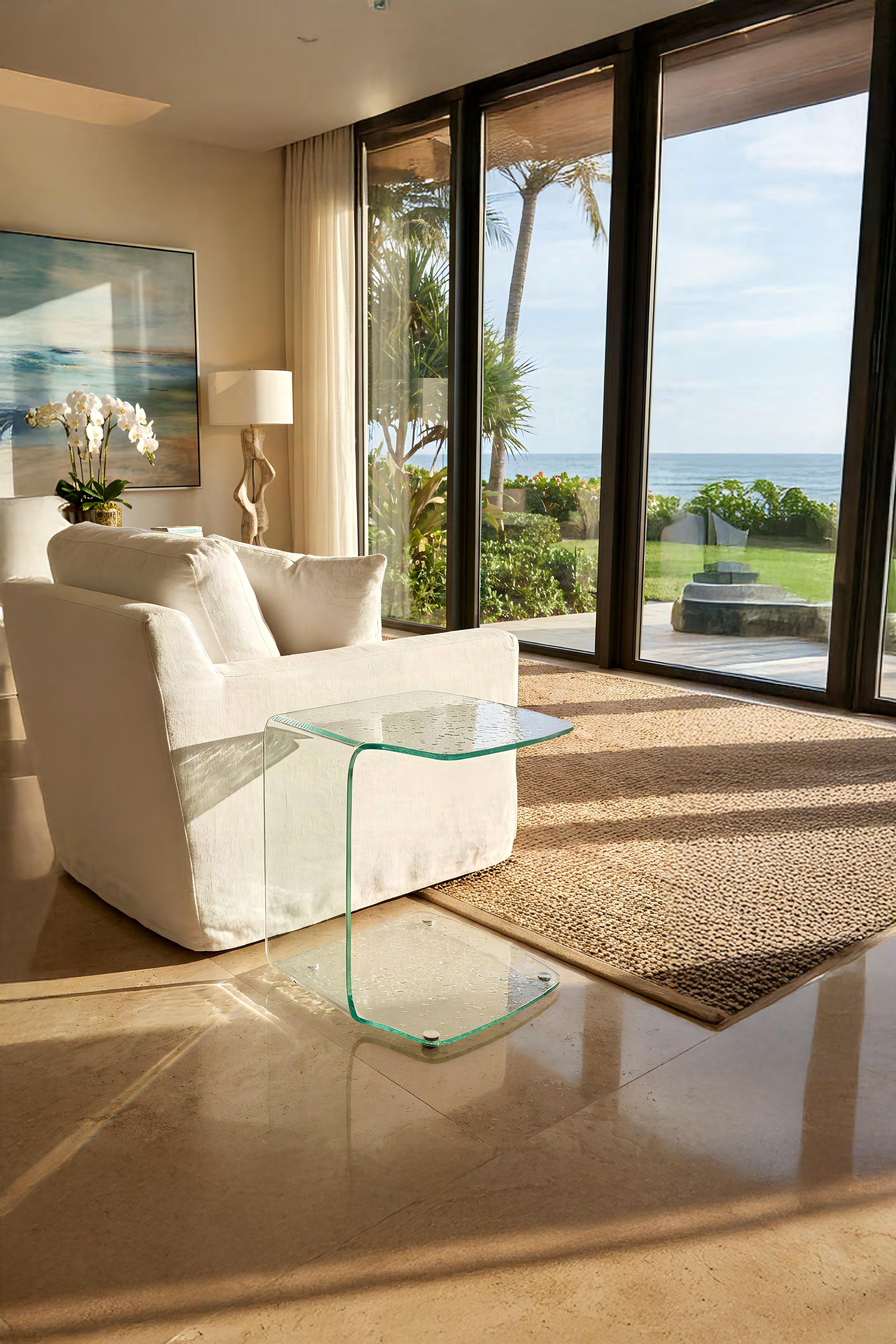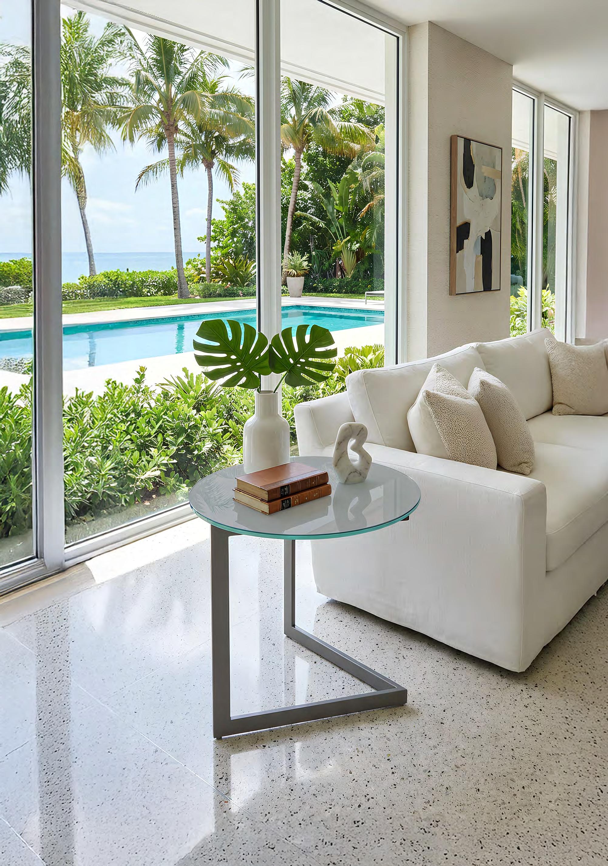 10mm (3/8”) extraclear tempered glass. Glass top attached to metal base. Size Ø H inchesRBST–Cut 4821.718.9 cms