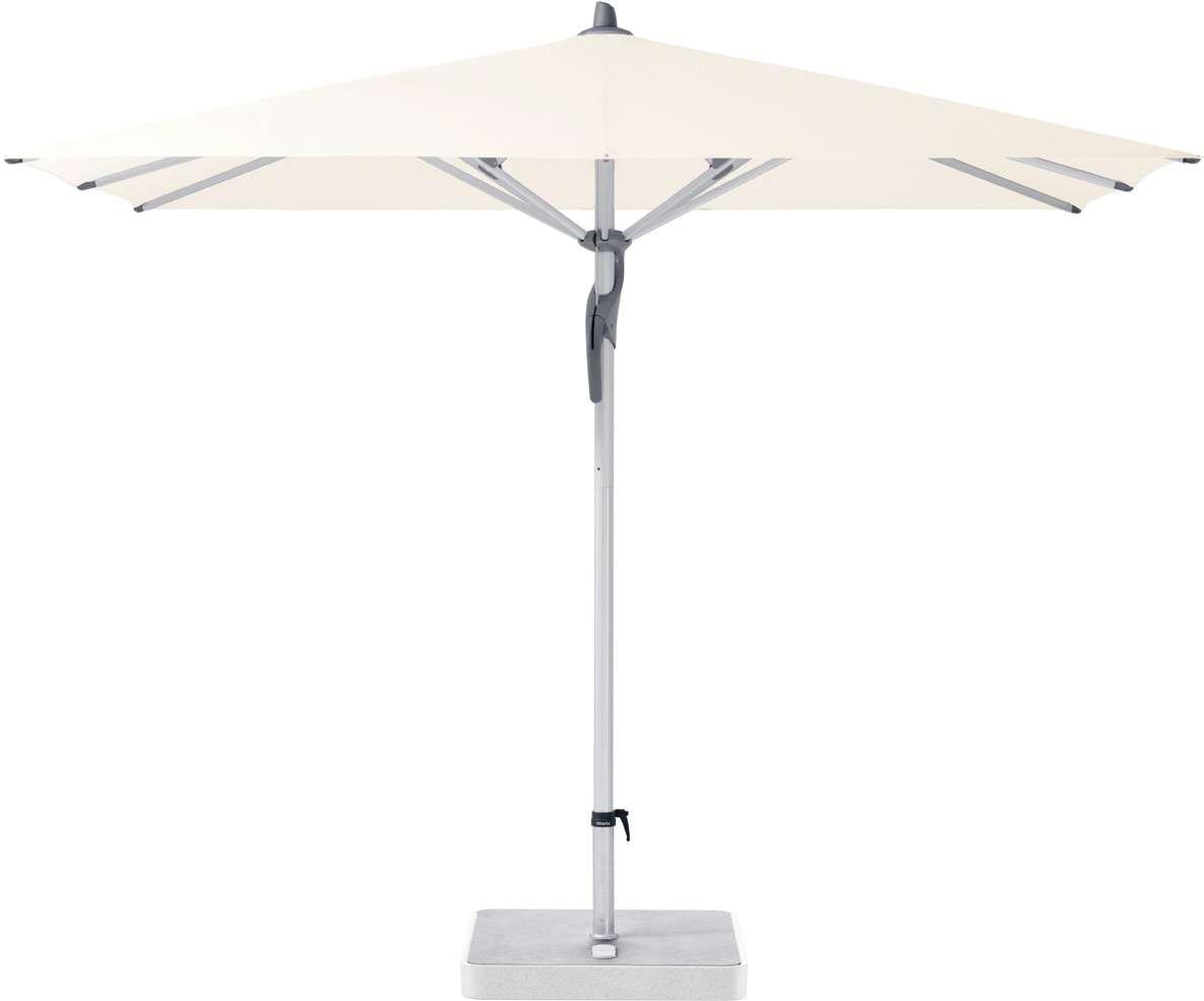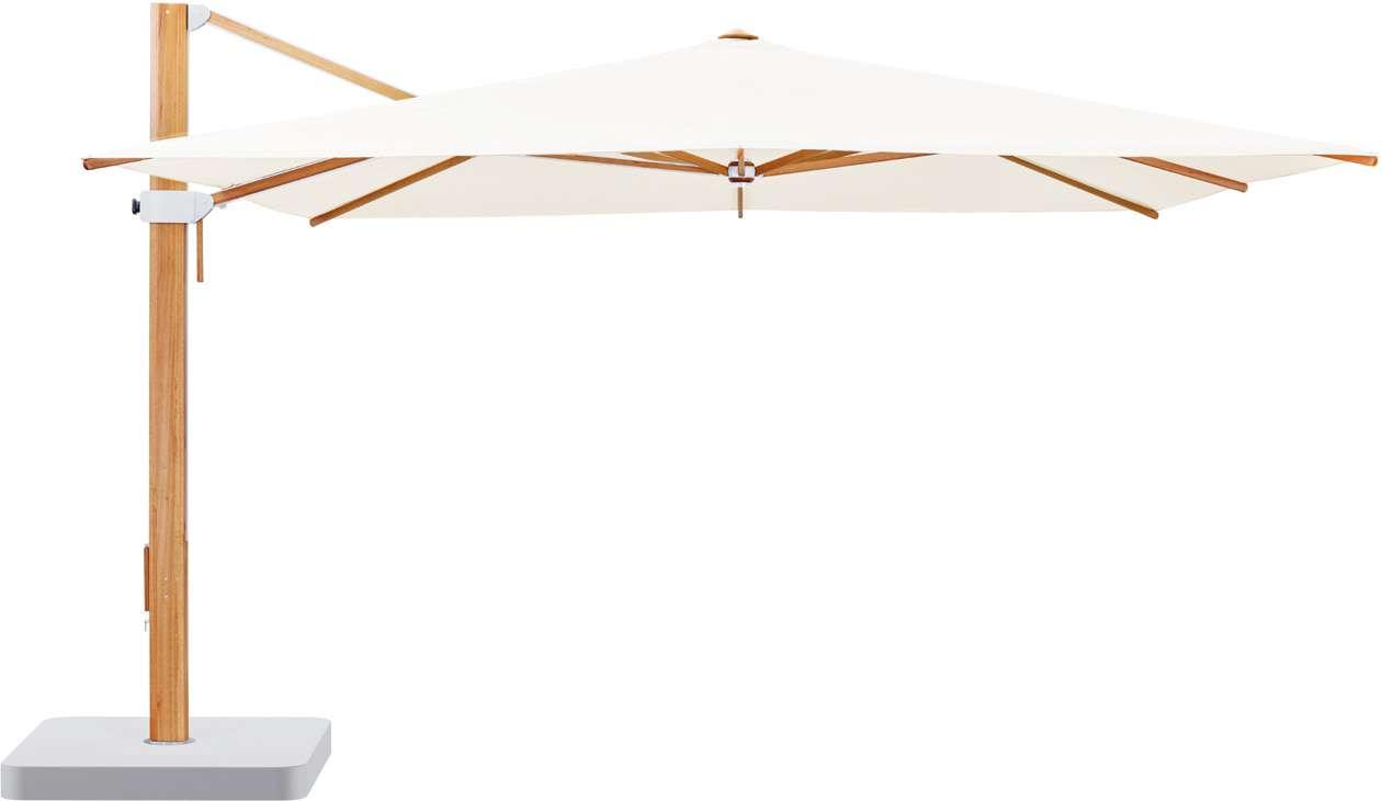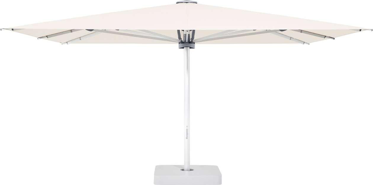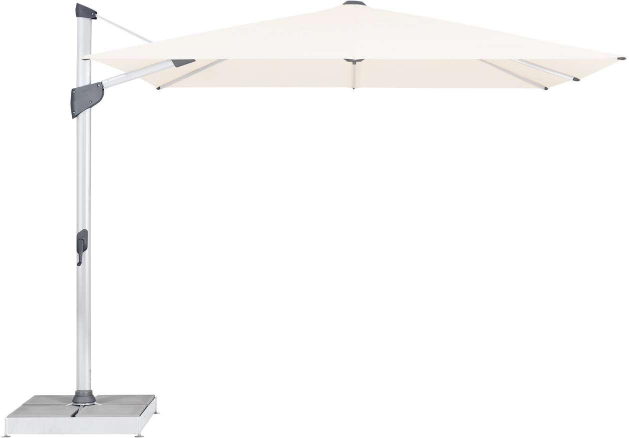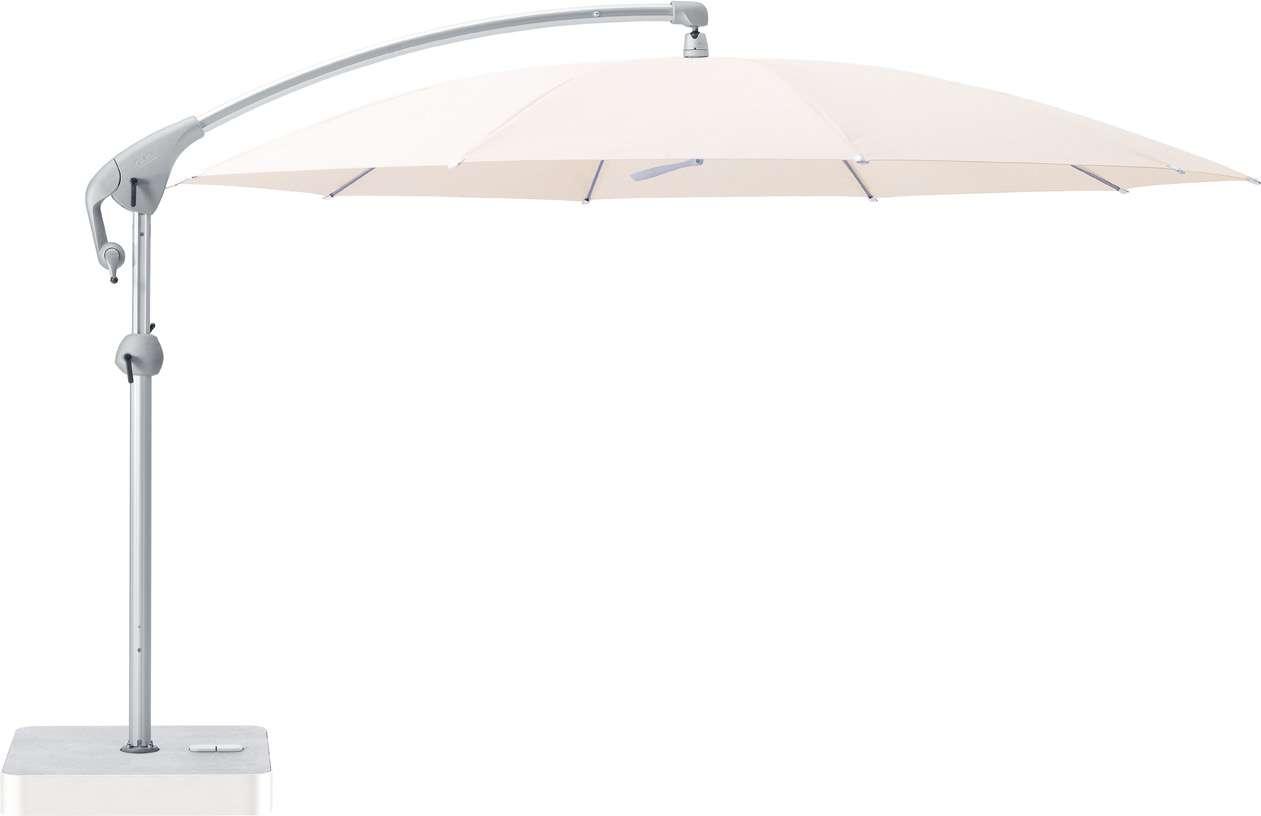 Das weiss und anthrazit pulverbeschichtete Aluminium des Gestells und der Streben sorgt mit dem flachen Schirmdach für die moderne, schwebende Optik. Der hochwertige Schirmstoff ist dank flexibler Enden selbstspannend. Für den Stock mit innenliegendem Standrohr ist ein Unterstock erhältlich, mit dem sich die Schirmhöhe anpassen lässt und so stets einen optimalen Schattenwurf garantiert. Typisch Schweizer Präzision.