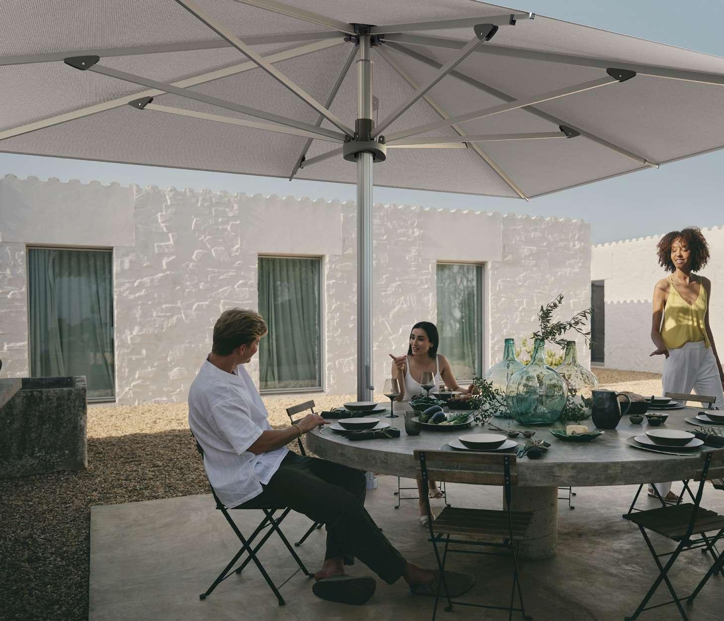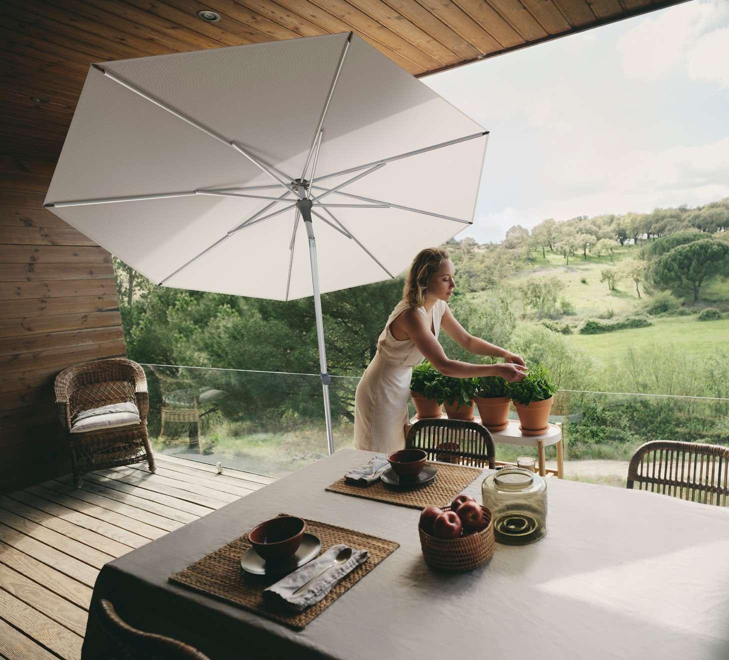 So leicht haben Sie den Dreh raus für 360° Sonnenschutz voller Stil und Klasse: Sombrano S+ ist der erste Seitenmastschirm, der sich via Kurbeldrehung wie von Zauberhand synchron öffnet und horizontal ausrichten lässt. Das ist perfekter Bedienkomfort und maximaler Sonnenschutz bei schrankenlosem Raumgefühl in zeitloser Eleganz.