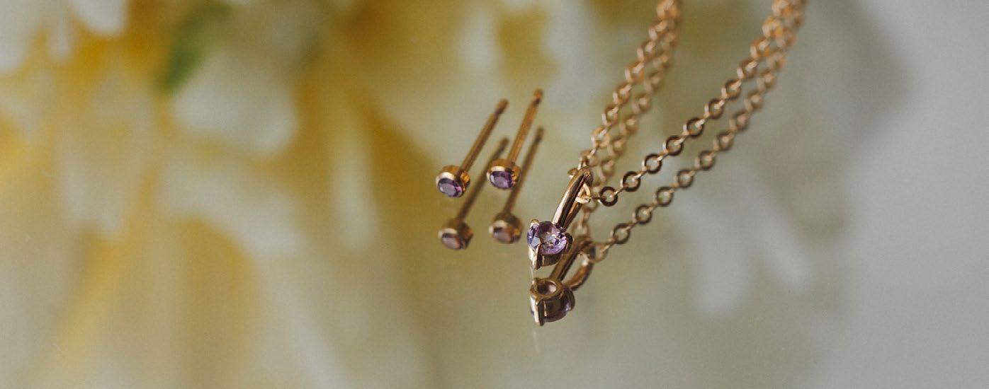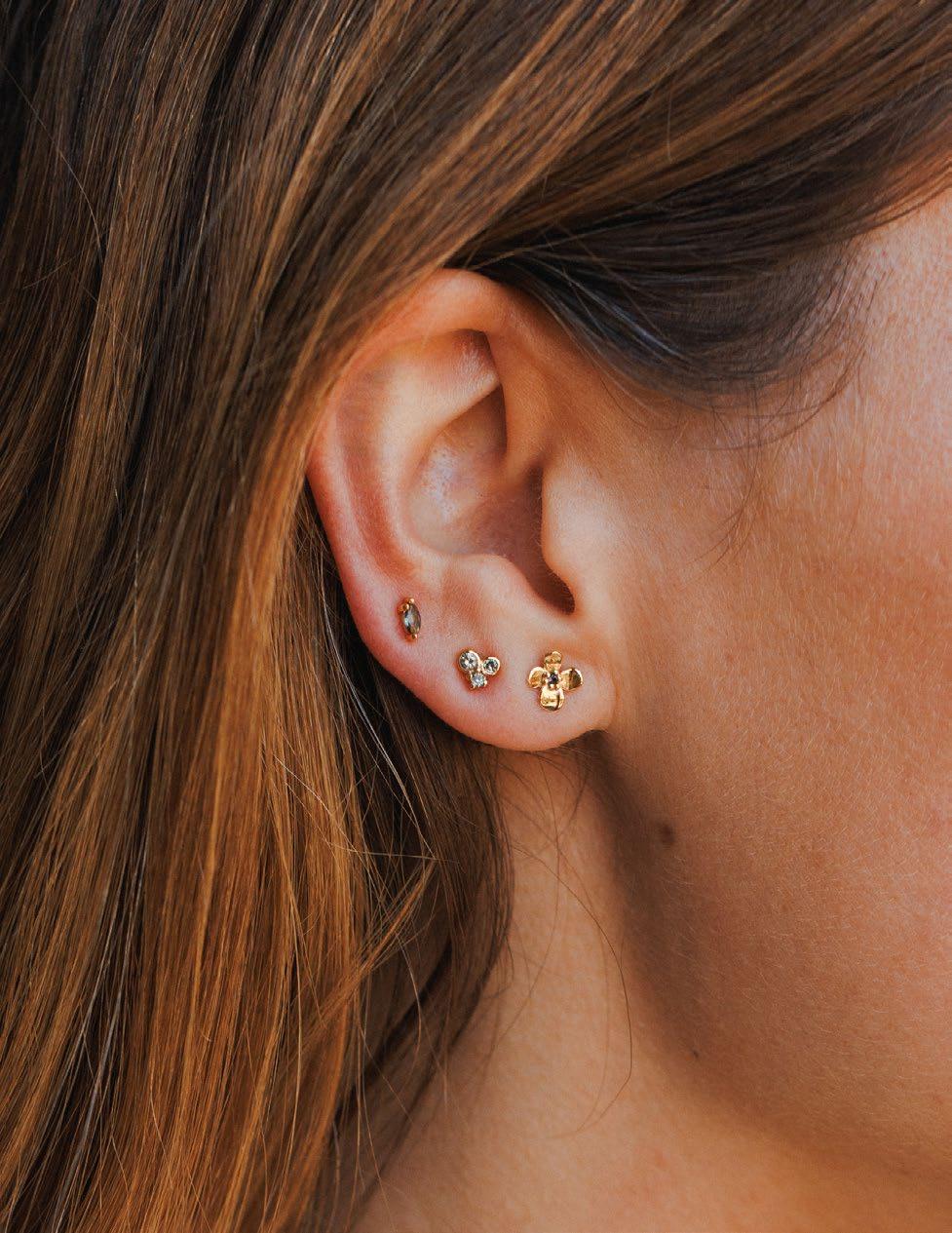 Top: 14k Gold Fill Harmony Necklace, $59. Vermeil Forest Emerald Leaflet Studs, $42. Vermeil Spring Haiku Studs, $48. Vermeil Midnight Blossom Studs, $48. | Bottom: 14k Gold Fill Flora Meuse Band, $88. 14k Gold Fill Faun Chain, $84