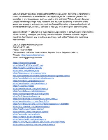 GLEADS is a Digital Marketing Agency specializing in providing services such as: Website Design, Google advertising, Facebook advertising, YouTube advertising, Content Marketing, Brand Identity Design, and SEO Services. Established in 2017, GLEADS offers communication solutions, specializing in consulting and implementing branding strategies for businesses. GLEADS Digital Marketing Agency P: +65 3138 1666 A: 9 Raffles Place, #29-05, Republic Plaza, Singapore 048619 W: https://gleadsglobal.com/en E: service@gleadsglobal.com