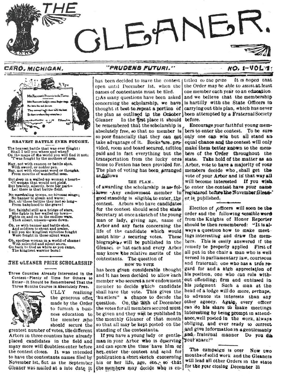 The fi rst issue of The Gleaner was printed on the presses of the Courier in the fall of 1894. It described the new order and answered questions about the insurance program. Early copies were not dated but seem to have been mailed every four or fi ve weeks. The fi rst complete copy in the fi les is Number 3, Volume 1, printed in December 1894. Another issue, either Number 1 or Number 2, is in the fi les but cannot be identifi ed because the masthead is missing. If there were 12 papers printed the fi rst year, as seems likely, the copies for January and March 1895 also are missing. Nearly all others have been saved, creating a valuable historical record. Slocum printed and mailed the fi rst issues of The Gleaner free of charge.