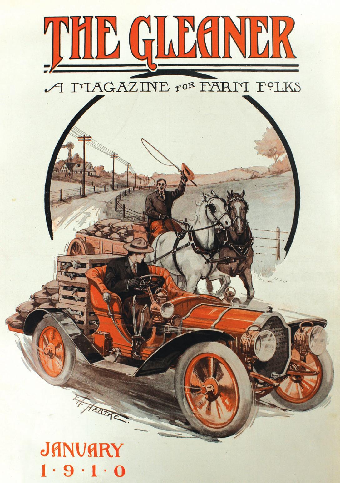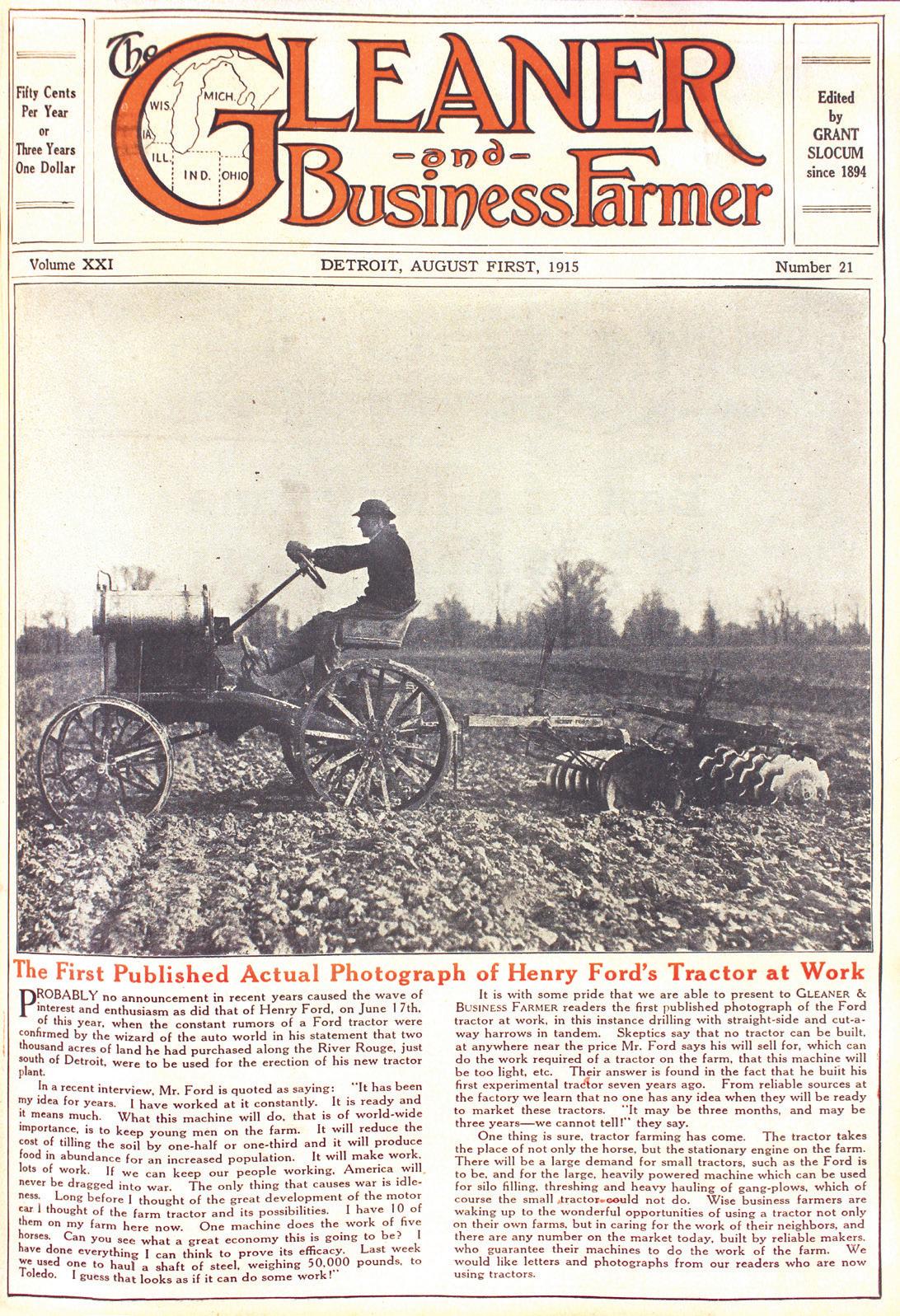 The August 1915 cover showed “the rst published actual photograph of Henry Ford’s tractor at work.” It also showed how The Gleaner had merged and expanded to include a large quantity of farm news. “How often do we overlook the simple things of life even when they bear all the evidence of the simplicity of greatness. In an obscure corner of a daily paper we found the following: ‘Huddled in the rear end of a wagon box and enshrouded in a mantle of snow, A.T. Perry, his wife and three little children were found frozen to death near Rapid City, South Dakota. They had lost their way on the open prairie in a blizzard. The bodies of the father and mother formed a shelter for the protection of the little ones. The parents had utilized all available blankets including clothing from their own bodies, in a vain attempt to keep their children alive.’ A far too simple tale, this story of these farm folks’ sacri ce, to meet with more than passing mention, amid the lengthy descriptions of divorce proceedings and tales of crime with which our press is lled. And yet it is a tale replete with heroism and pathos, to those who count their days by heart throbs, and who see in life something deeper and more signi cant than a calendar of sins and crimes.”