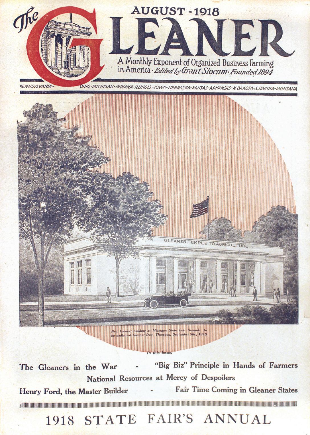 The August 1918 issue pictured the Gleaner Building erected for the Michigan State Fair that year.