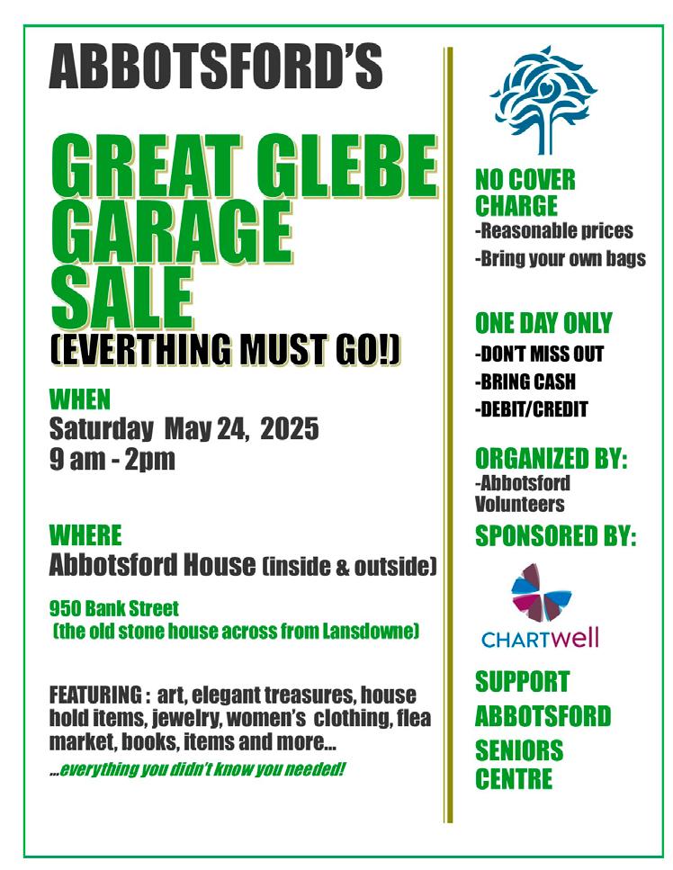 I would like to emphasize a key point in his article: through the Great Glebe Garage sale, you can provide muchneeded support for the Ottawa Food Bank. Last year, thanks to the generosity of area residents, we raised $13,500. As Woods says, the garage sale isn’t just a feel-good event, it also what a community can do in the name of an important cause. Let’s see if we can beat last year’s total! You can give online or via the collection tins that will be circulating with volunteers throughout the day.