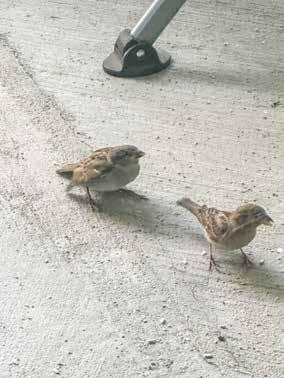 I was astonished to see the older birds feeding this new generation of sparrow chicks. The chicks made no attempt to feed themselves, even though they had developed the flying ability to make their way to my thirdfloor balcony. I felt, somewhat critically, that they were like adolescents who had graduated from high school, living in their parents’ basement off the fat of the land. The parent birds have no hesitation in feeding their chicks and will do so while only occasionally