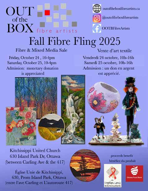 FALL FIBRE FLING The fabulous fibre arts sale by the multi-talented artists of Out of the Box, will be held on Fri, Oct 24 and Sat , Oct 25, 10 a m -4 pm at Kitchissippi United Church, Island Park Dr Come and see one-of-a-kind treasures, stay for demonstrations, and chat with on-site artists