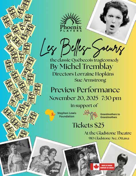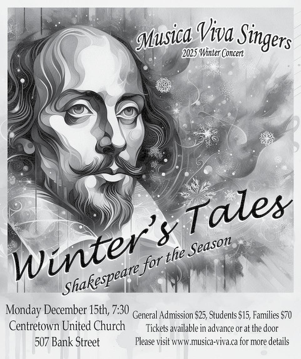 MUSICA VIVA SINGERS Musica Viva Singers is excited to announce “Winter’s Tales,” a concert featuring musical settings of Shakespeare’s poetry from across five centuries, including works by some of Canada’s finest composers Local actor Robin Guy of Three Sisters Theatre Company will help bring the language to life Our collaboration will welcome winter with open arms! Tickets: $25 General Admission, $15 Limited-Income & Students, $70 Family Pass (two or more adults with any number of children) All ticket types are available from choir members about a month before the concert or can be purchased online through the MVS website at www musica-viva ca The concert will be on Mon Dec 15 at 7:30 p m at Centretown United Church (507 Bank Street) which is accessible by ramp LOST & FOUND