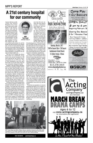 Anyone who has recently note that this site satvisited The Ottawa isfies the local interest groups, community Hospital’s Civic Camassociations and resipus would surely speak dents of the area. highly of the doctors, Now is the time that nurses, staff, and the care they received there. we move forward in It is without question that the planning process in Ottawa we have some to develop a new Civic of the most qualified Campus. I am excited that past December, the and well-trained mediMPP cal practitioners serving Ontario government Yasir Naqvi all our families, seniors announced a $3 million yasirnaqvi.onmpp.ca and children. To furCapital Planning Grant for the early stages of ther enhance the work this planning process. This process will our medical professionals do and the health care they provide to our commugive us clarity on what services will be nity, we have to ensure that they have provided at the new Civic Campus, the the most recent state-of-the-art facility functional design of the hospital, and and equipment. That is why building a integration of services amongst health new, revitalized Civic Campus of The care facilities across our region. I am Ottawa Hospital is essential for our city also assured that this process will entail and our future health care. extensive community consultations. The new Civic Campus has always When it comes to health care delivbeen about our community. It has ery, we have a lot to be proud of. Over the last 10 years there has been a crane stood at its current location for 100 years and the new site will be receivat every hospital in Ottawa - Monting patients for yet 100 more. This fort Hospital has doubled in size, the Queensway Carleton Hospital has is a key institution in our city, and I know that we all want what is best for expanded significantly, there is a stateof-the-art regional cancer centre at the our community’s long-term health. General Campus of The Ottawa HosTogether, with The Ottawa Hospital, I have been consulting residents on how pital, a new wing at the Children’s they see their future health care serHospital of Eastern Ontario, and the vices. It has always been made clear to Ottawa Heart Institute is currently me that the new hospital has to be in going through a $200 million expanthe central core of the city, accessible sion. All these investments by Ontario to emergency vehicles via Queensway government are contributing to quality and through public transit. Our comhealth care in our vibrant and growing city. To continue with this momenmunity wants and deserves access to a world-class, 21st century health and tum, I am committed to ensuring that wellness facility close to home - serva new Civic Campus is built to serve ing a growing and aging community. our community in the central core and communities across the city and the All three levels of government have been working together to find the most region. suitable location for the new Civic If you have any questions or concerns regarding the future Civic Campus, or Campus. I am glad that The Ottawa Hospital’s community board and staff want to know what the next steps are, have endorsed Sir John Carling site as please do not hesitate to contact my the best possible location. It is situated Community Office at ynaqvi.mpp.co@ centrally with appropriate accessibilliberal.ola.org or 613-722-6414. I know ity to emergency vehicles. Further, it that we are all committed to bringing is on the LRT’s Trillium Line, linkthe best and most cutting-edge health ing the new campus to Confederation care to our community. In the end, this Line and communities in the south hospital will serve all of our greater end of the city. It is also important to well-being.