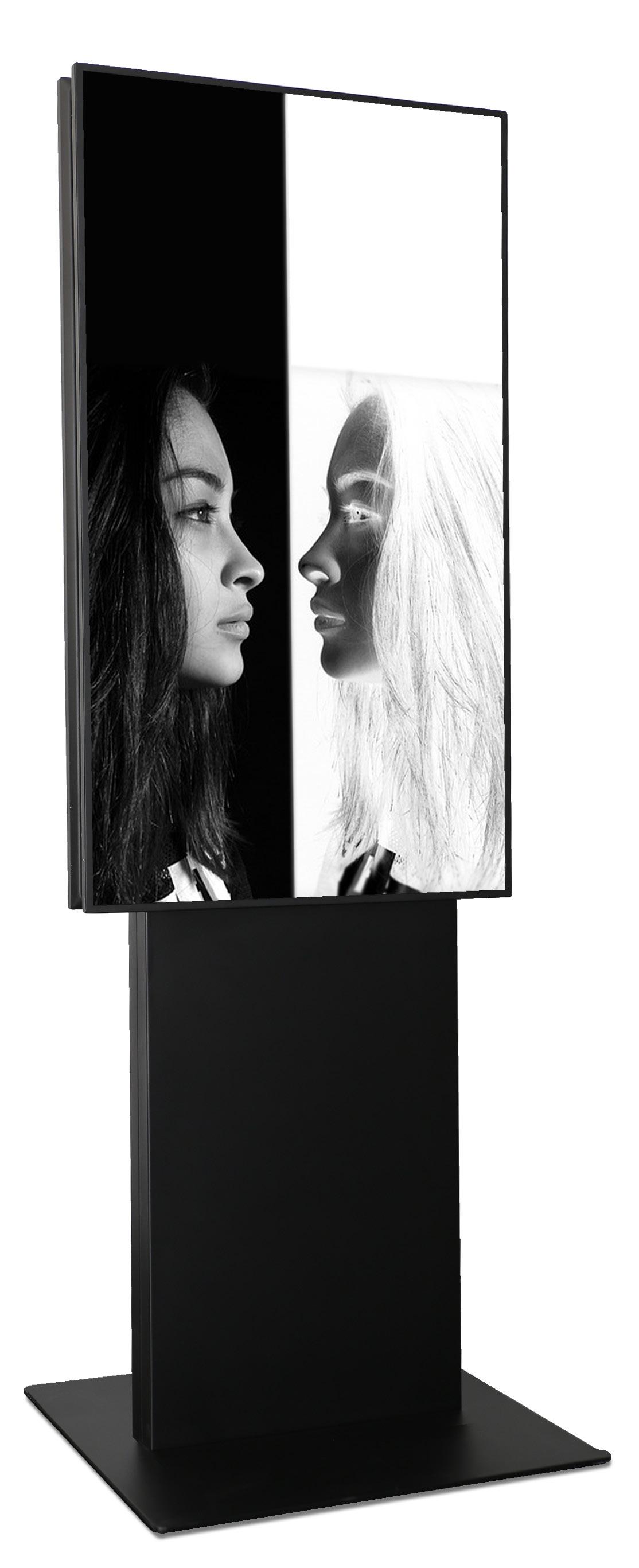 Stele Back to Back - diese formschöne Stele im schlichten Design überzeugt durch ihre Einfachheit. Die Stele ist freistehend und hat eine Displayaufnahme für zwei Displays zur Montage Rücken an Rücken.