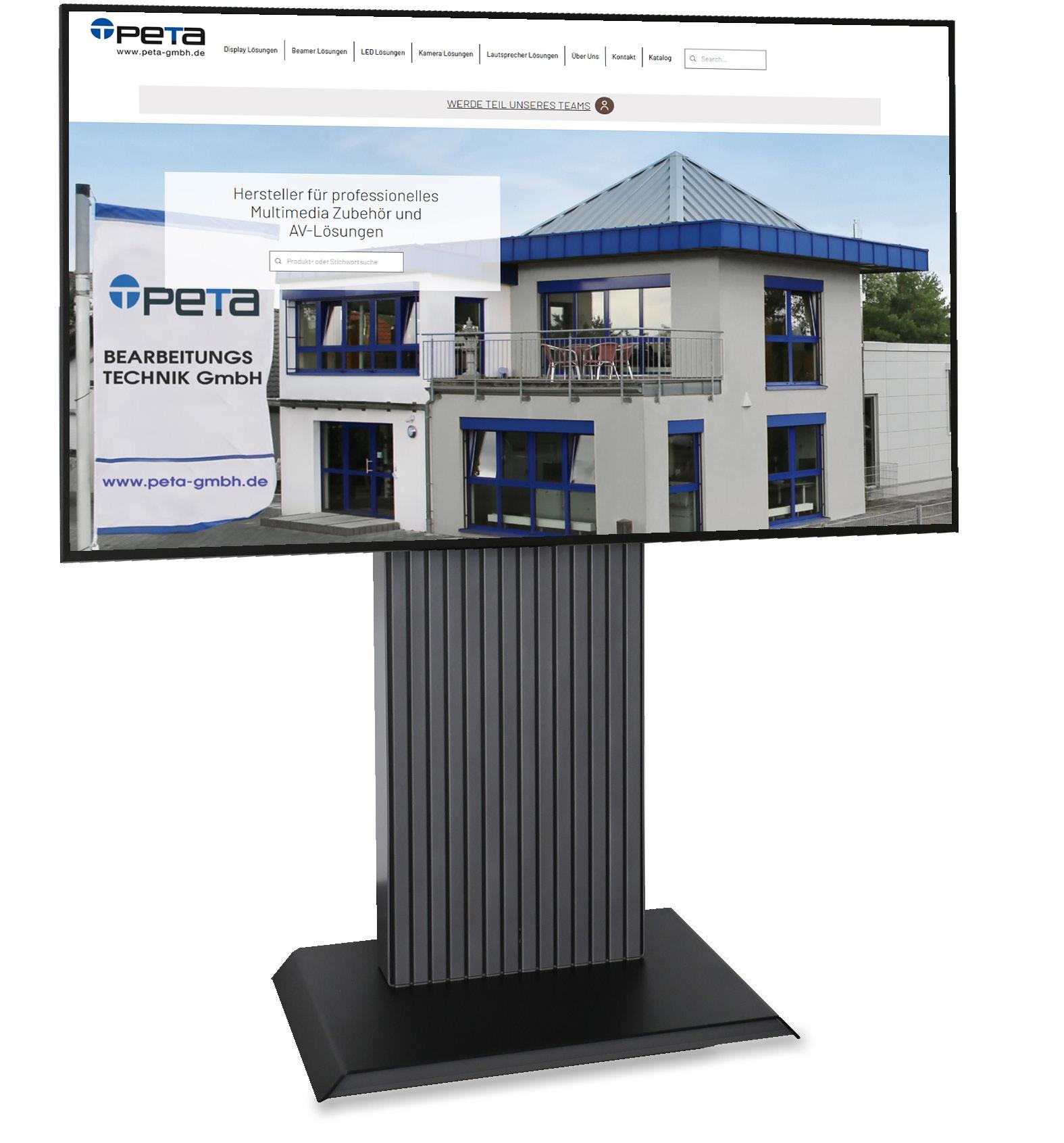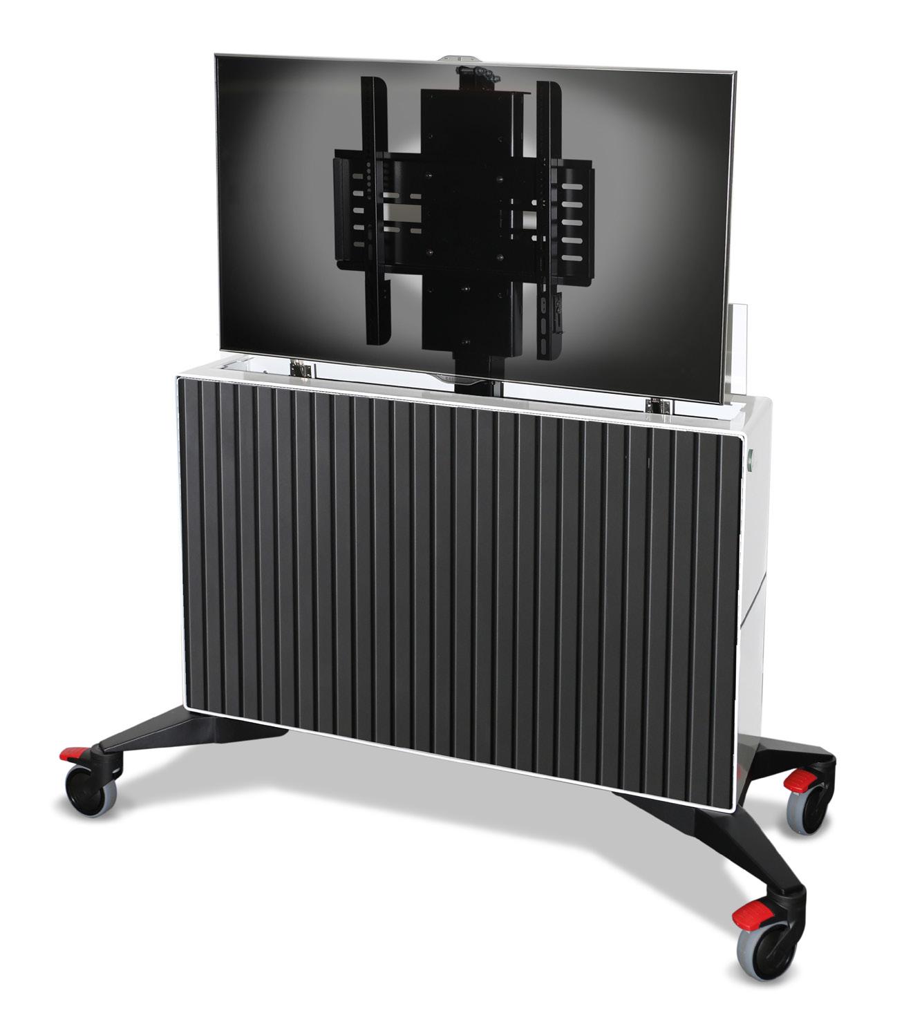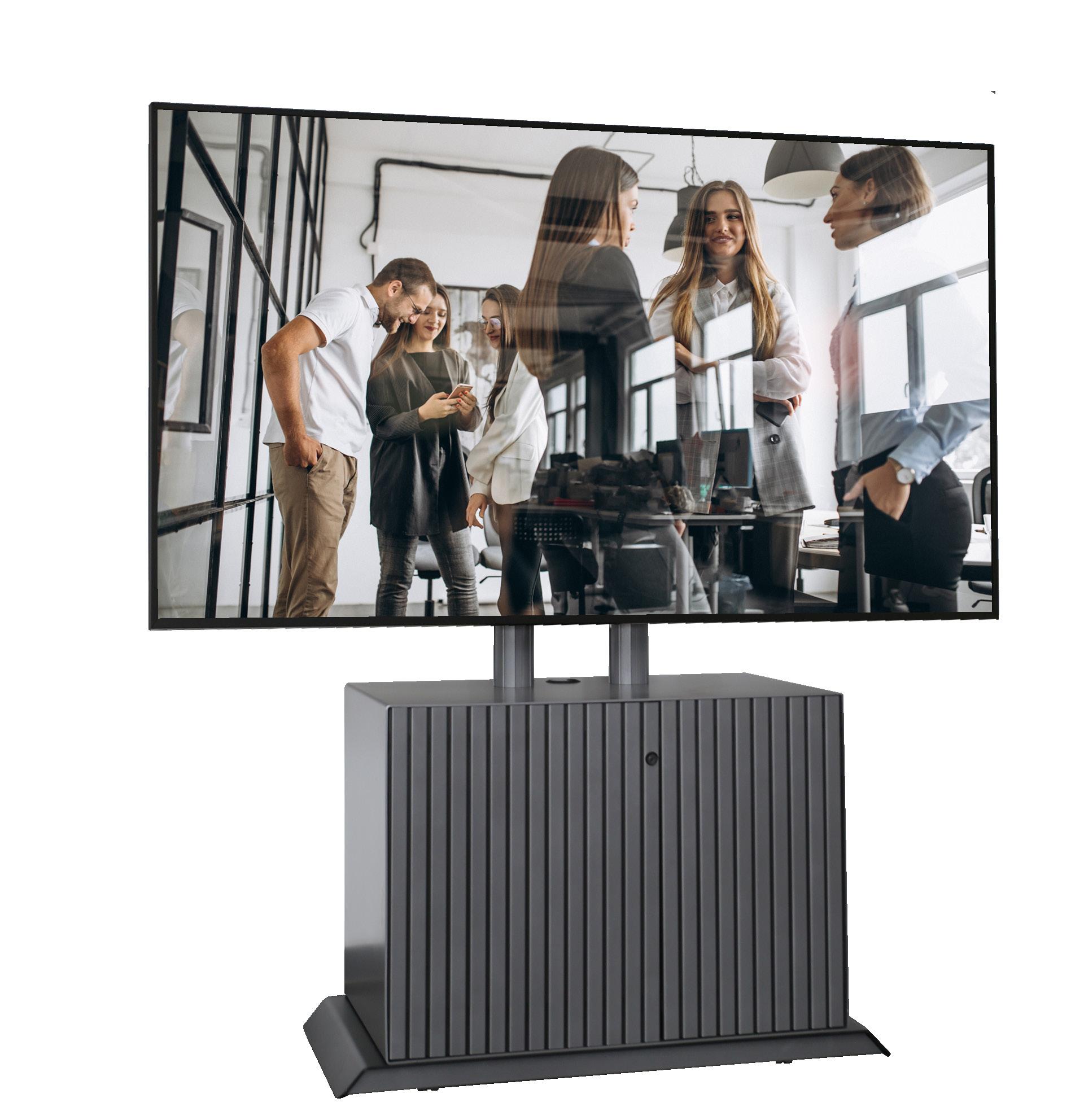 TITAN - ist ein Rollgestell für Displays von 60“ bis 103“ oder max. 100 kg. Der TITAN ist eine elektrisch, höhenverstellbare Displayhalterung mit einer Universalhalterung bis VESA 1200x600. Der Motor ist Robust und Wartungsfrei. In einer Kammer in der Säule befindet sich zusätzlicher Platz für Zuspielgeräte. Die Kabelführung verläuft unsichtbar hinter einer Blende des Standfußes. Der Standfuß ist mobil durch 4 robuste Lenkrollen - safe drive!