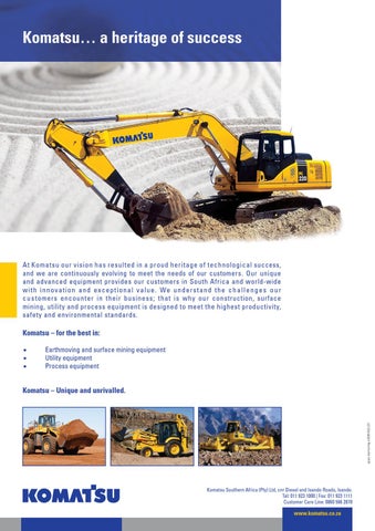 At Komatsu our vision has resulted in a proud heritage of technological success, and we are continuously evolving to meet the needs of our customers. Our unique and advanced equipment provides our customers in South Africa and world-wide w i t h i nnovati on and ex ceptional value. We u n d e rst a n d t h e c h a l l e n g e s o u r c u s tomers encounter in their business; that is why our construction, surface mining, utility and process equipment is designed to meet the highest productivity, safety and environmental standards.