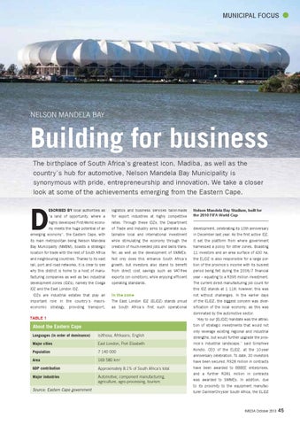 Building for business The birthplace of South Africa’s greatest icon, Madiba, as well as the country’s hub for automotive, Nelson Mandela Bay Municipality is synonymous with pride, entrepreneurship and innovation. We take a closer look at some of the achievements emerging from the Eastern Cape.