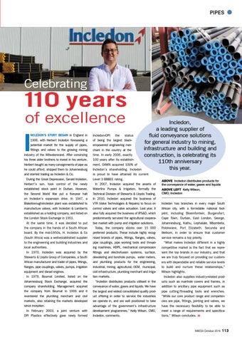 Incledon-DPI the status of being the largest blackempowered engineering merchant in the country at the time. In early 2006, exactly 100 years after its establishment, DAWN acquired 100% of Incledon’s shareholding. Incledon is proud to have attained its current Level 3 BBBEE rating. In 2007, Incledon acquired the assets of Waterlinx Pumps & Irrigation, formally the Technical Division of Stewarts & Lloyds Trading. In 2010, Incledon acquired the business of VTR (Valve Technologies & Repairs) to focus on control valves and valve actuation. Last year, it also fully acquired the business of IPS&D, which predominantly serviced the agricultural cooperative market with pump and irrigation solutions. Today, the company stocks over 15 000 preferred products. These include highly recognised brands of pipes, fittings, flanges, valves, pipe couplings, pipe working tools and threading machines, HDPE, mechanical compression fittings and electrofusion systems, surface, dewatering and borehole pumps, water meters, and plumbing products for the engineering, industrial, mining, agricultural, OEM, municipal, civil infrastructure, plumbing merchant and irrigation markets. “Incledon distributes products utilised in the conveyance of water, gases and liquids. We have the largest and widest consolidated quality product offering in order to service the industries we operate in, and are well positioned to take advantage of the government’s infrastructure development programmes,” Kelly Wilson, CMO, Incledon, comments.