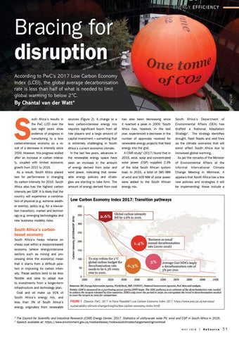 outh Africa’s results in the PwC LCEI over the last eight years show evidence of progress in transitioning to a less carbon-intensive economy as a result of a decrease in intensity since 2009. However, this progress stalled after an increase in carbon intensity, coupled with limited economic growth from 2015 to 2016. As a result, South Africa placed last for performance in changing its carbon intensity for 2016. South Africa also has the highest carbon intensity per GDP. It is likely that the country will experience a combination of physical (e.g. extreme weather events), policy (e.g. for a low-carbon transition), market and technology (e.g. emerging technologies and new business models) risks.