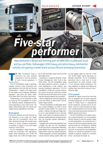 Fit for purpose Specified for regions around the world that are not equipped with the latest high-tech workshop equipment, the VW Constellation range is finding favour in subequatorial African operations, primarily due to its reliability – built on a robust chassis and ‘easyto-fix’ driveline based on the Cummins ISBe Turbo intercooled power-plant and Eaton FS 6306 B manual transmission. “The VW Constellation truck range is growing in stature because it is a ‘fit-for-purpose’ vehicle, tailored to meet the specific needs of niche applications. As a business tool, it strikes the optimum balance between price and life-cycle cost. Fuel efficiency, reliability and ease of servicing effectively keep its total cost of ownership low and predictable, making it an attractive proposition for specialised on-highway operators in Southern Africa,” concludes Van Graan.