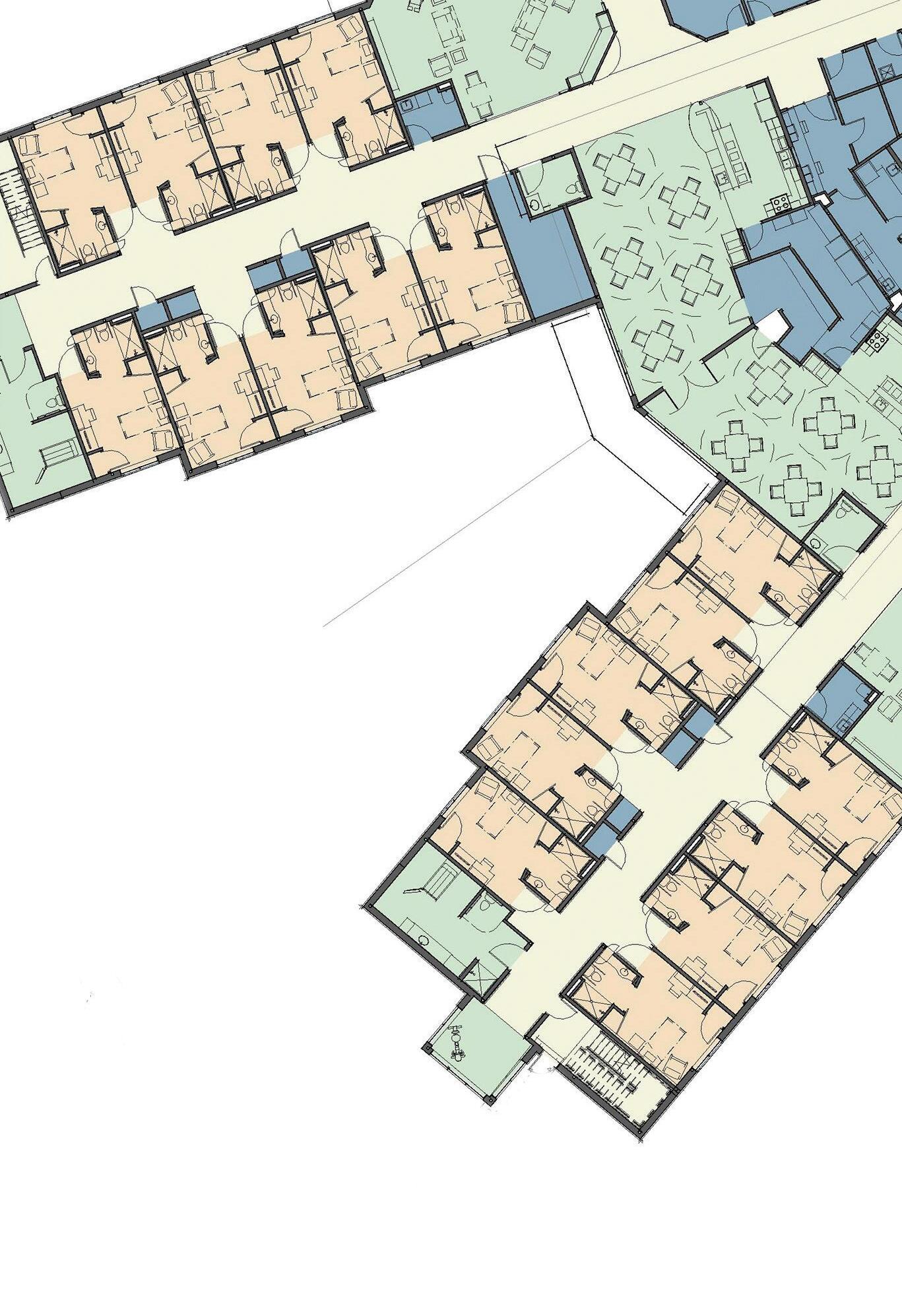 The new building has four households with similar floor plans. Each household has 18 resident rooms, a spa, two sunrooms, a living room, a laundry room, a household dining room, a family dining room and a kitchen.