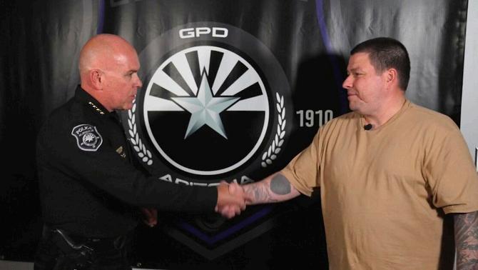 Peters credits our officers for helping him achieve sobriety, rebuild his relationship with his children, and land a job at a sobriety facility. Watch heartfelt stor d shaking hand )