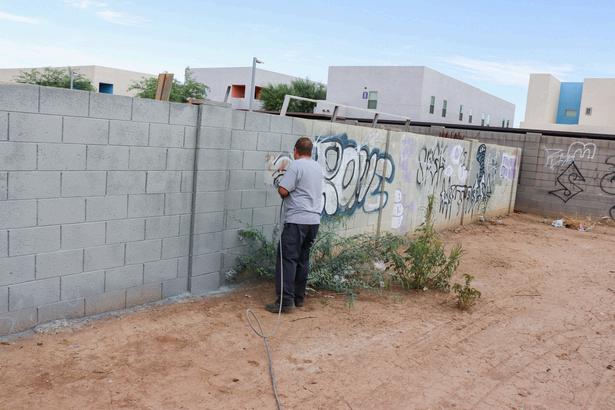 Recently the two-person group covered graffiti along walls in an area that had repeatedly been targeted in a vacant lot off 65 Avenue between Maryland Avenue and Ocotillo Road Our city has a Graffiti Busters team - Michael Siebert and Albert Morales - who help keep our city clean and beautiful. Michael and Albert use either spraypaint or rollers dipped in paint to cover the graffiti. Power washers are utilized to wash off graffiti that is on sidewalks or asphalt parking lots.