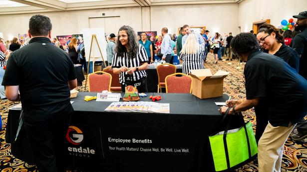Wearing black-and-white referee-style shirts and sports jerseys to represent their favorite teams to match the “Score big with your benefits” theme, employees in many departments shared information about the many great benefits available, while giving goodies. Representatives from health insurance companies, Grand Canyon University (GCU), medical offices and other businesses shared how city employees can hit home runs with their services and programs.