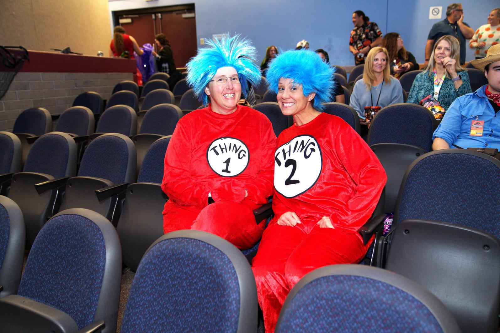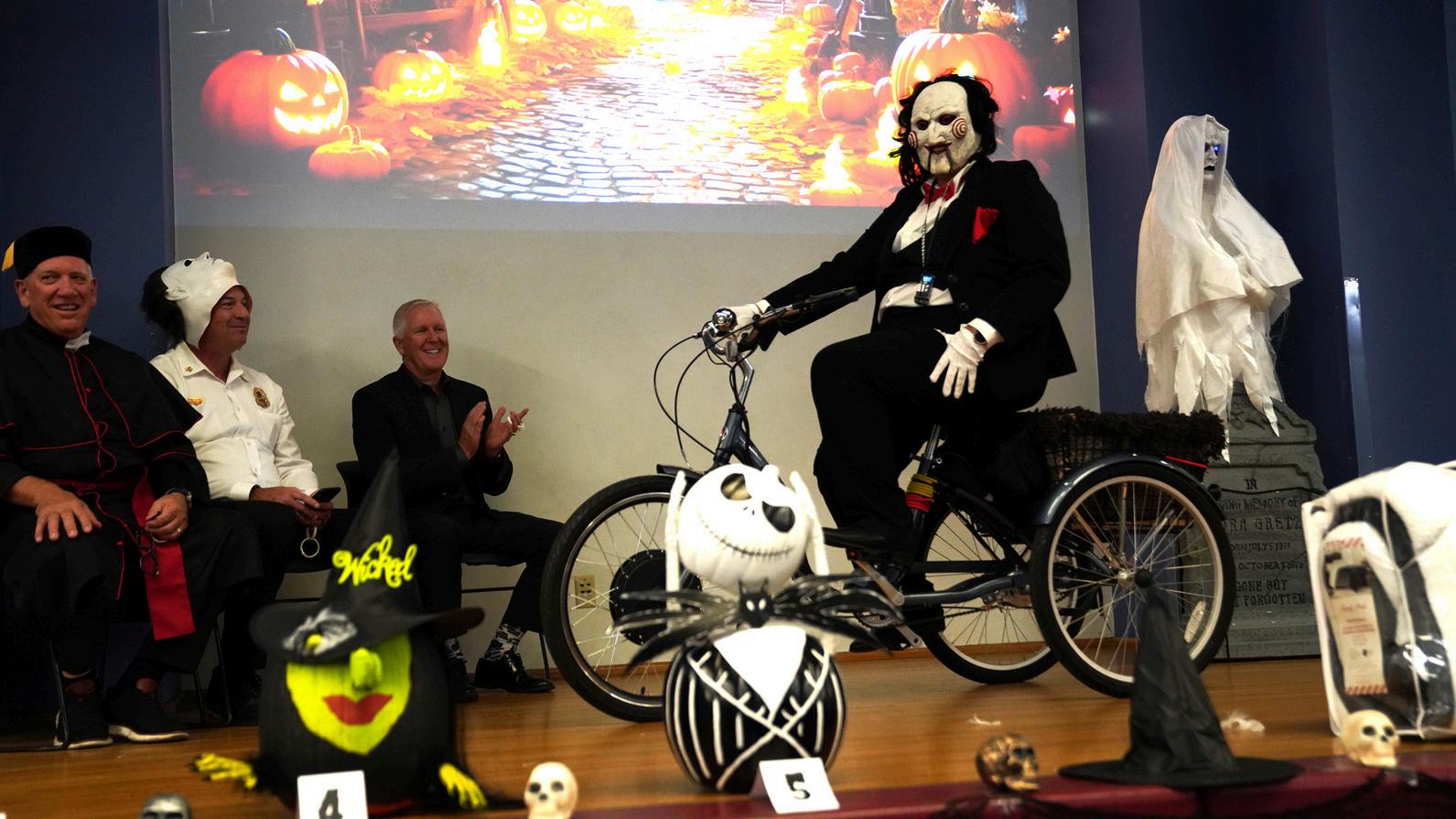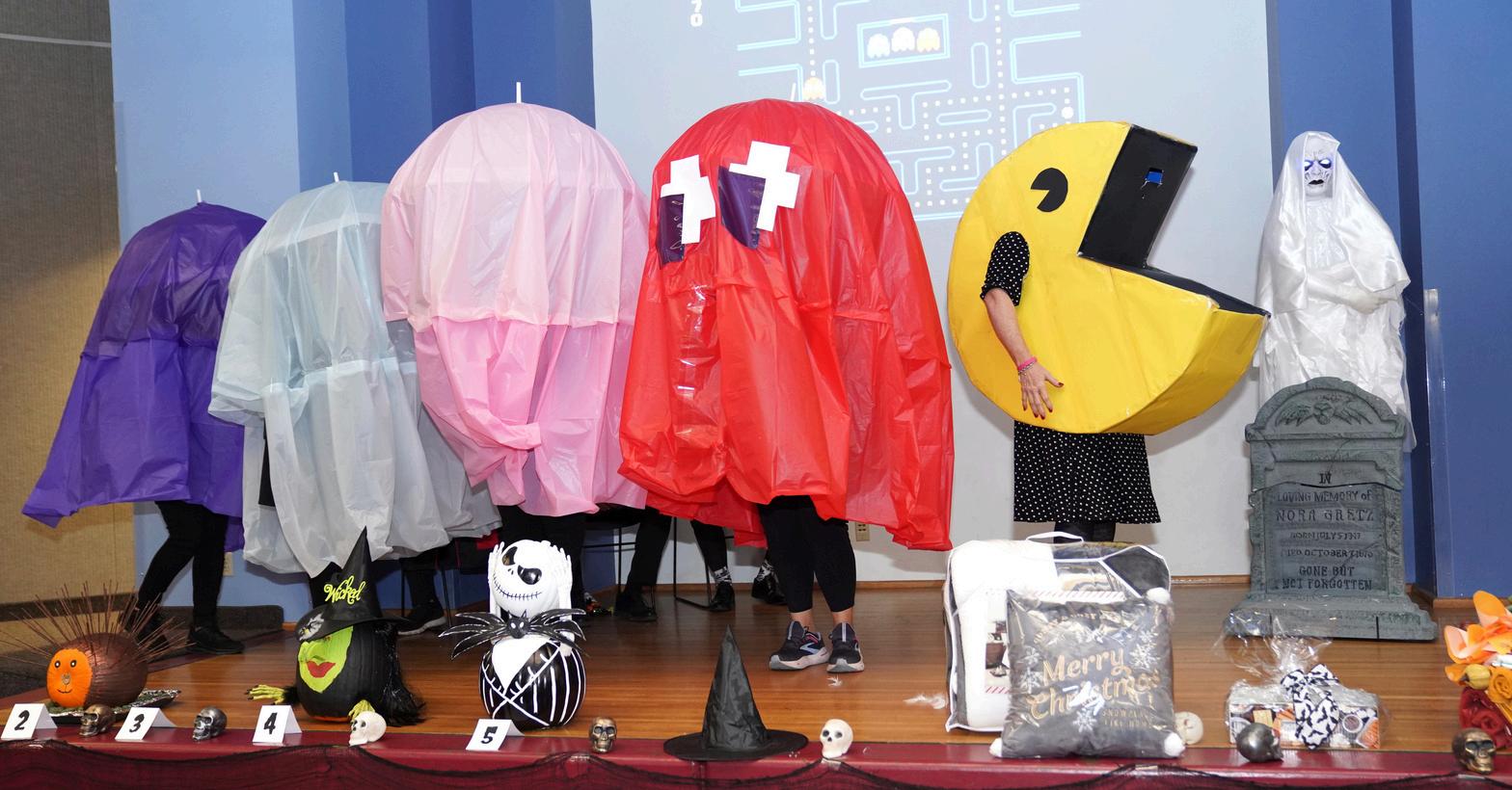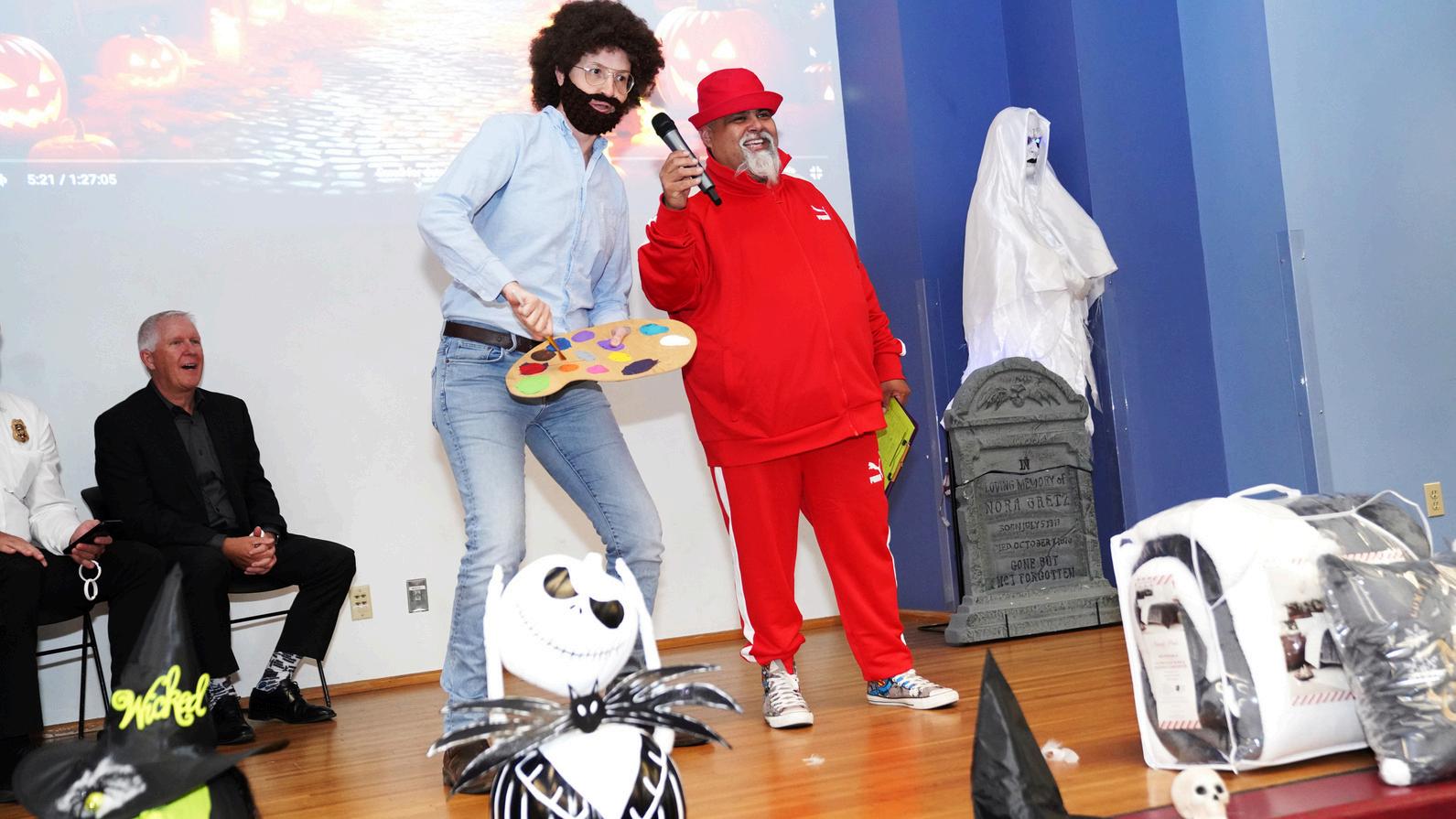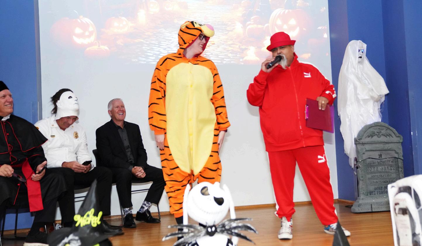 Employees delighted the costume contest judges - City Manager Kevin Phelps, Fire Chief Ryan Freeburg and Director of Engineering Don Bessleras they paraded across the stage dressed in a variety of creepy, cute and funny outfits. Some of the elaborately crafted costumes included a hippie, a shower-curtain-ring salesman (inspired by a character in the movie “Trains, Planes & Automobiles”), a witch, Thing 1 and Thing 2 and painter Bob Ross.