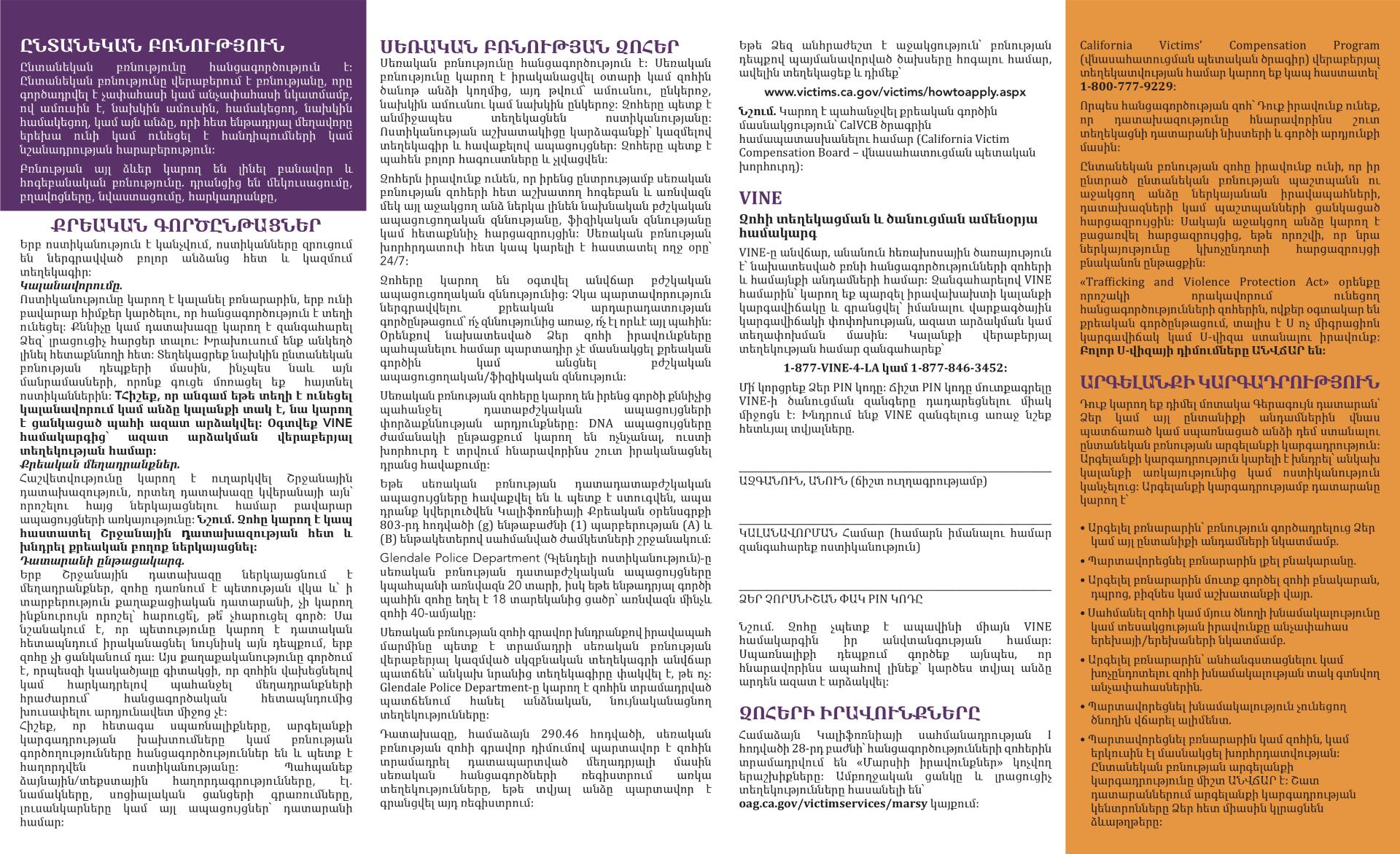 Domestic Violence and Sexual Assault Pamphlet 2025 (ENGLISH, SPANISH, ARMENIAN)