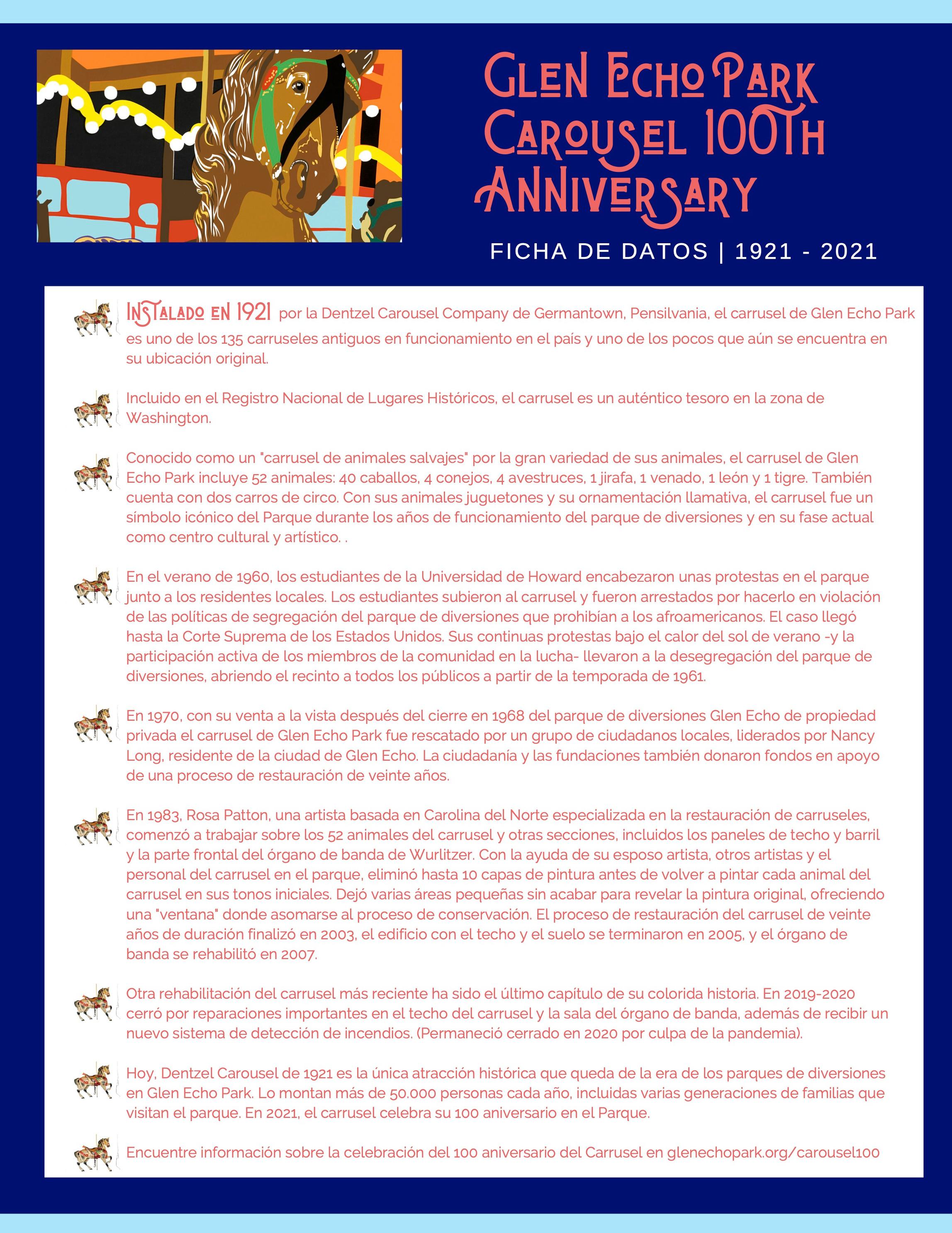 With our Carousel 100th Anniversary celebration, as well as concerts, camps, and special events, we reached out to many new audiences through new partnerships with local organizations that serve diverse communities in the Washington region. We partnered with Story Tapestries, Montgomery History, Identity, Community Bridges, Future History Now, and others And we produced many of our marketing materials as well as our Carousel Fact Sheet in Spanish in order to reach more county residents in their native language