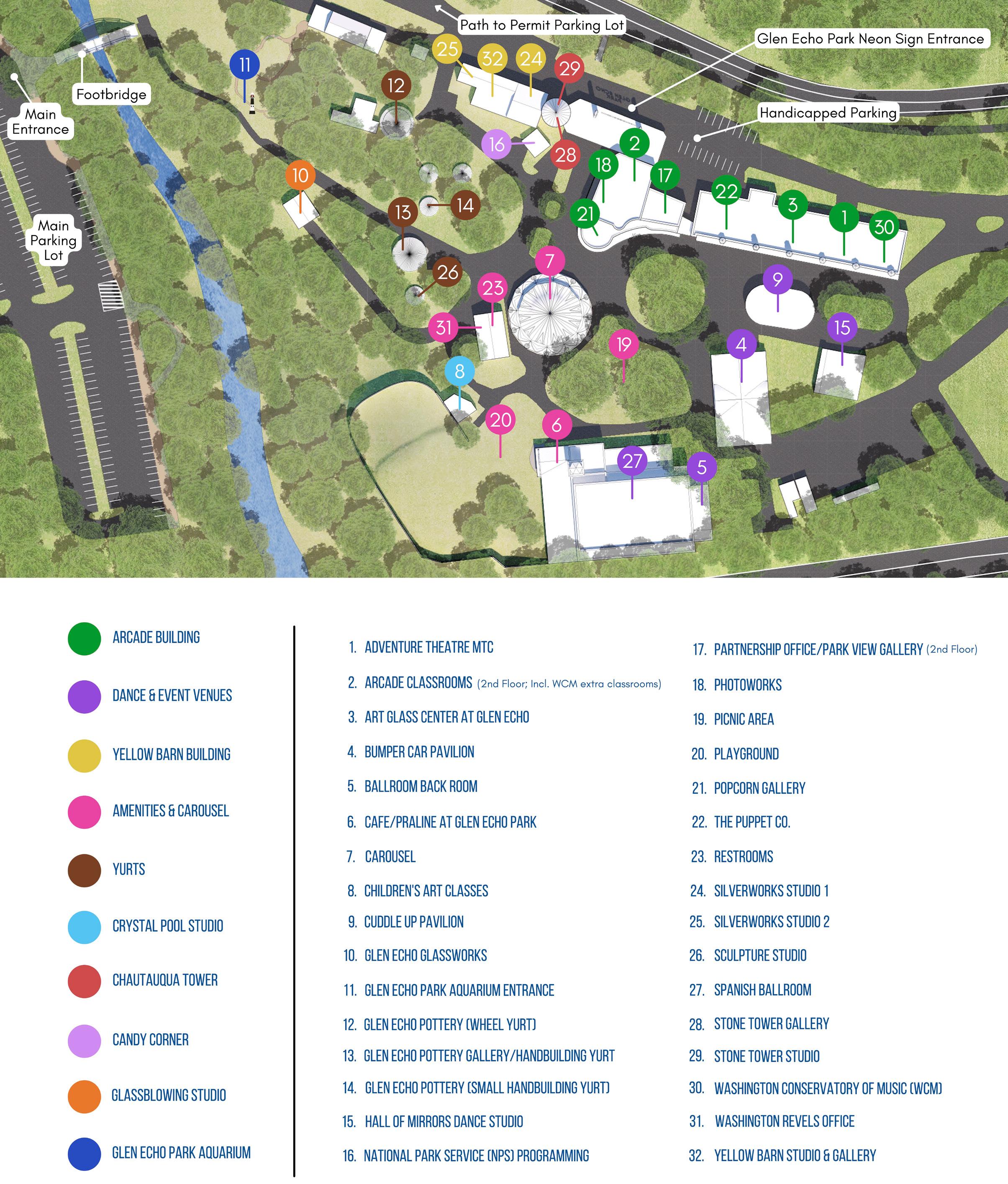 Free parking for Glen Echo Park is in a public parking lot located just of MacArthur Blvd on Oxford Road, across from the Glen Echo Shopping Center. From the parking lot, walk along the path across the Minnehaha Creek bridge and into the Park. Please do not park in “permit only” areas or the town streets near the Irish Inn.