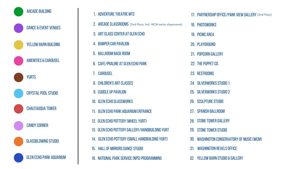 The Glen Echo Park Partnership office is located on the second floor of the North Arcade Building. Office hours are Monday through Saturday 10am to 6pm.