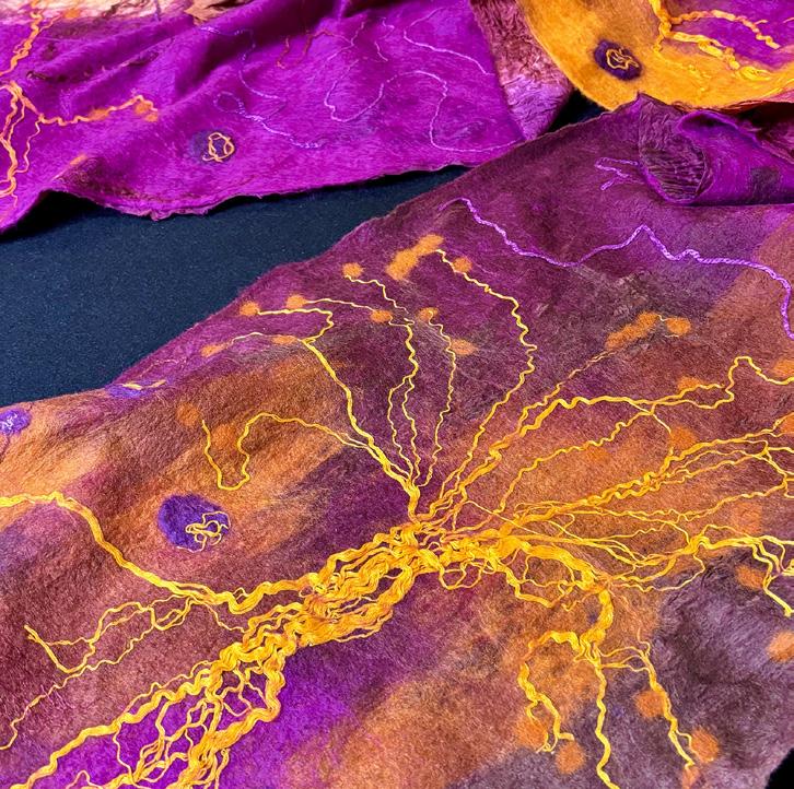 My art is about exploring color, texture, shape, and style to express and capture the energy and flow of each unique moment. I’m based in Vienna, and my primary medium is Nuno Felting, a process which I use to create organic, abstract scarves that emphasize spontaneity in design and color. I often start with eye-catching color combinations which give me energy and focus -- what combinations appeal to me at that moment in time and place. Starting with very fine Habotai or Margilan silk, I apply thin layers of Merino Wool, creating the design features -- abstract, geometric, nature, imagination -- adding embellishments to provide texture and enhance the transformative result. I hope to ignite movement and emotion in my viewers, reminding them to take joy in the raw beauty of the world around them and feel a special zing every time they wrap themselves in something beautiful.