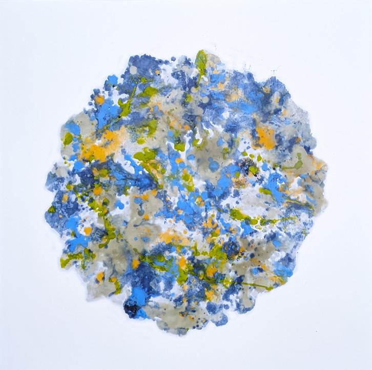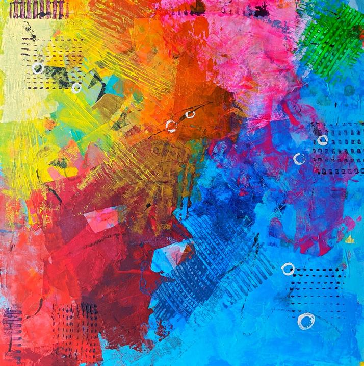 I begin a painting through play. I lean into impulse and curiosity. It’s a welcomed relief to not think or plan. I react to what I put down and wait for the painting to lead me to my next decision. Colors are often chosen because they are leftover on a palette from a prior piece and at other times, I select the colors based on my mood. I like utilizing limitations to make decisions with less analysis and more flow and even impulse. Organic spheres, circles, and geometric shapes often enter my work. I like the use of mixed media and often will use pastels, crayons, and pencils to make additional extensions of color and line. The use of differences at each juncture adds more complexity and intrigue. I seek to be enveloped as I create and to evoke sensory experiences for others in my art.