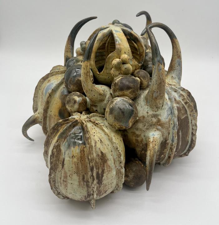Influenced by nature and organic forms, my hand-built sculptures and wall pieces are three-dimensional compositions composed of lines, the interplay of positive and negative spaces, proportion, and color. I strive for visual simplicity, movement, and balance of form. To achieve a particular color and surface quality, I use different clays and fire in reduction, oxidation and soda kilns or in a garbage can with wood shavings to obtain the desired effect.