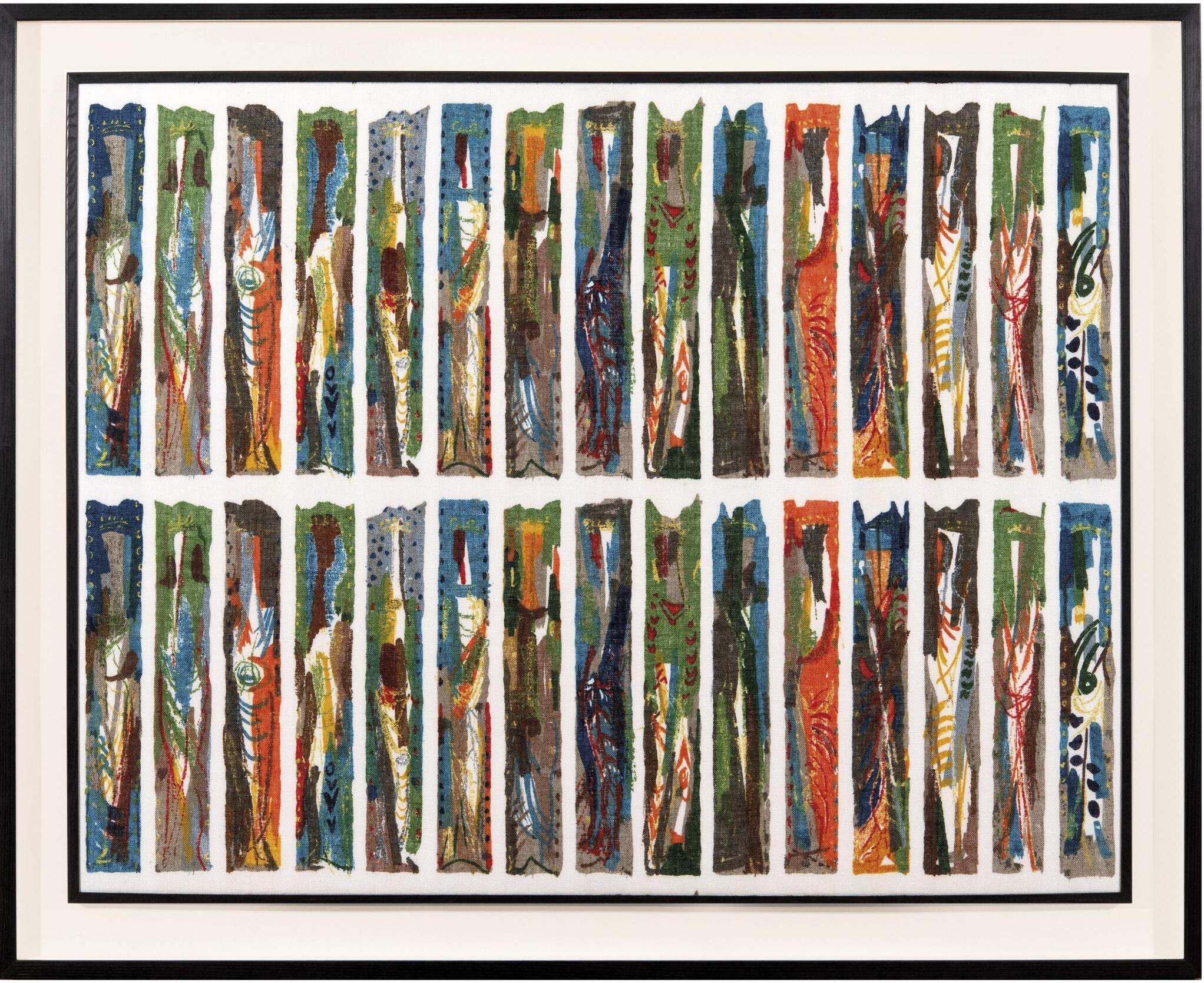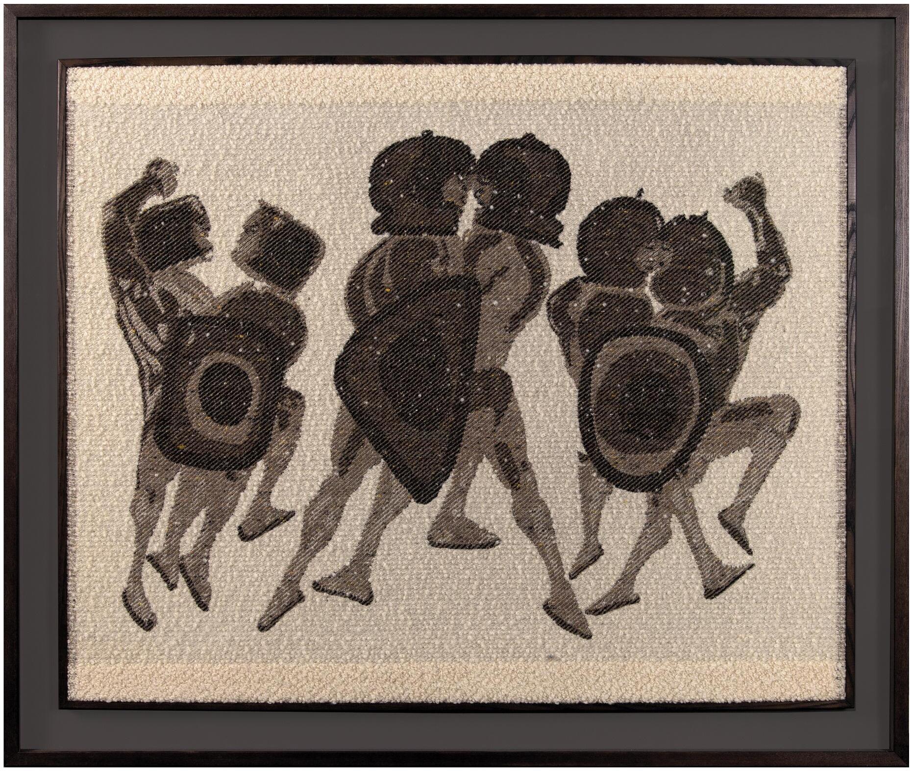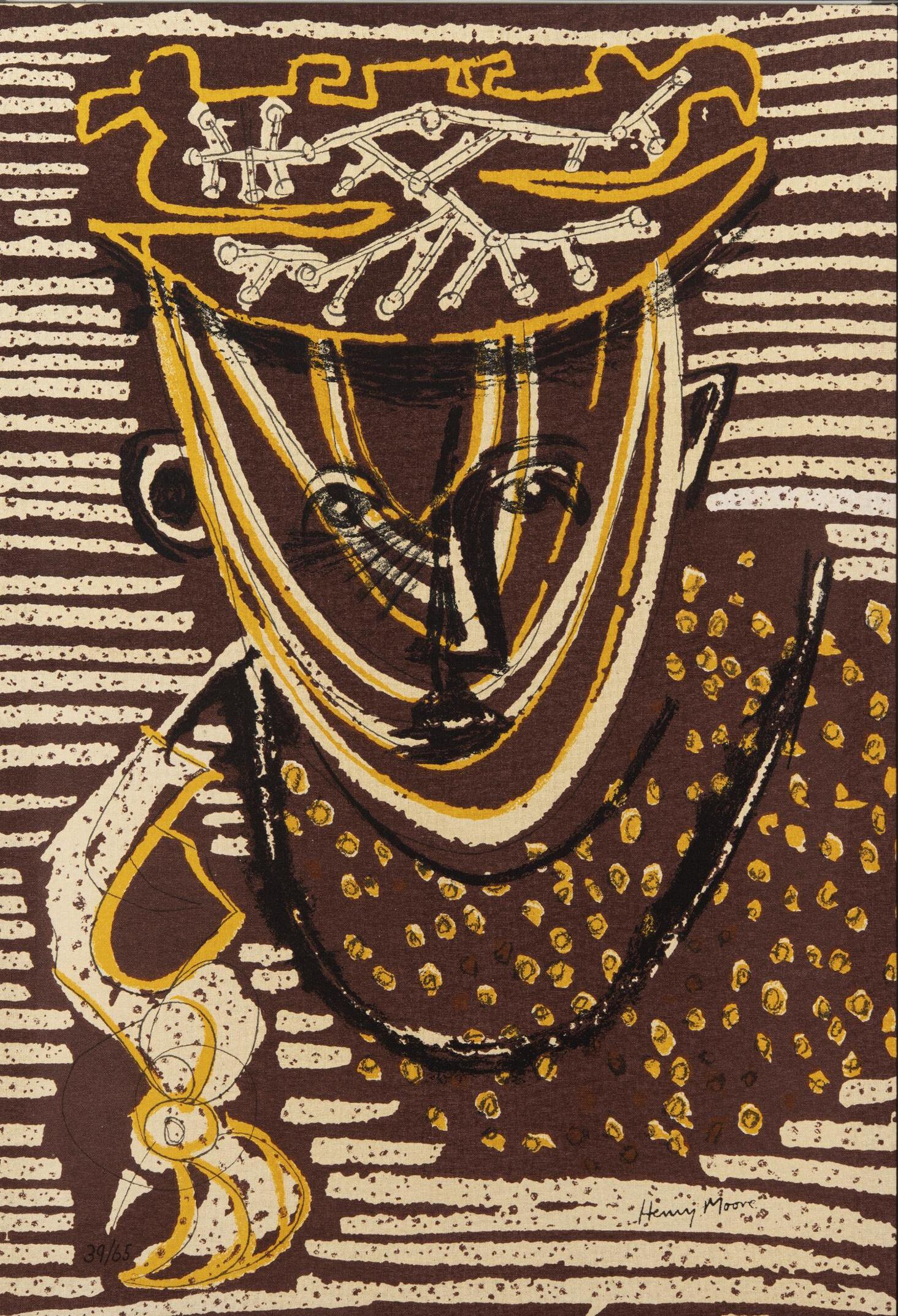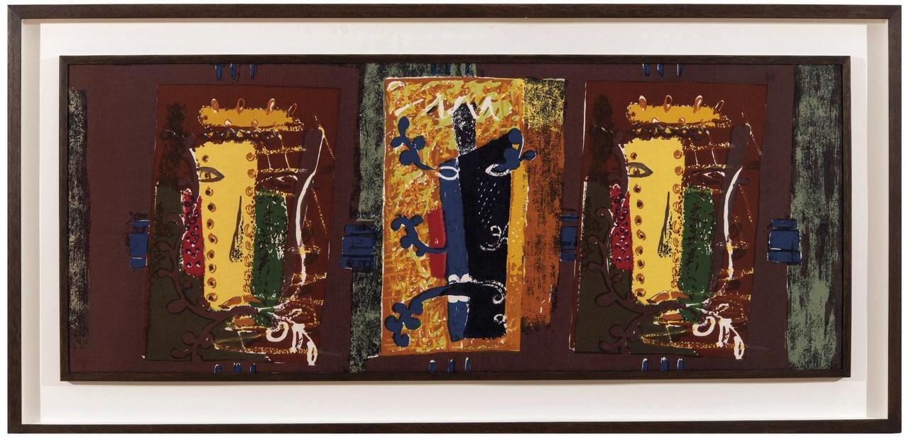 The original drawing for ‘ Warriors’, ‘Sketch for Warriors’ was exhibited alongside the textile itself at The Whitworth Art Gallery Manchester in 1962 ‘ Warriors’ was also exhibited and included in the catalogue of the ‘Alastair Morton Memorial Exhibition’ at Abbot Hall Art Gallery, Kendal in 1964 This impressive and thick jacquard weave was one of the most expensive of the artist textiles produced by Edinburgh Weavers. The ‘ Warriors’ themselves herald the arrival of the powerful Goggle Head sculptures that were to become a hallmark of Frinks later work
